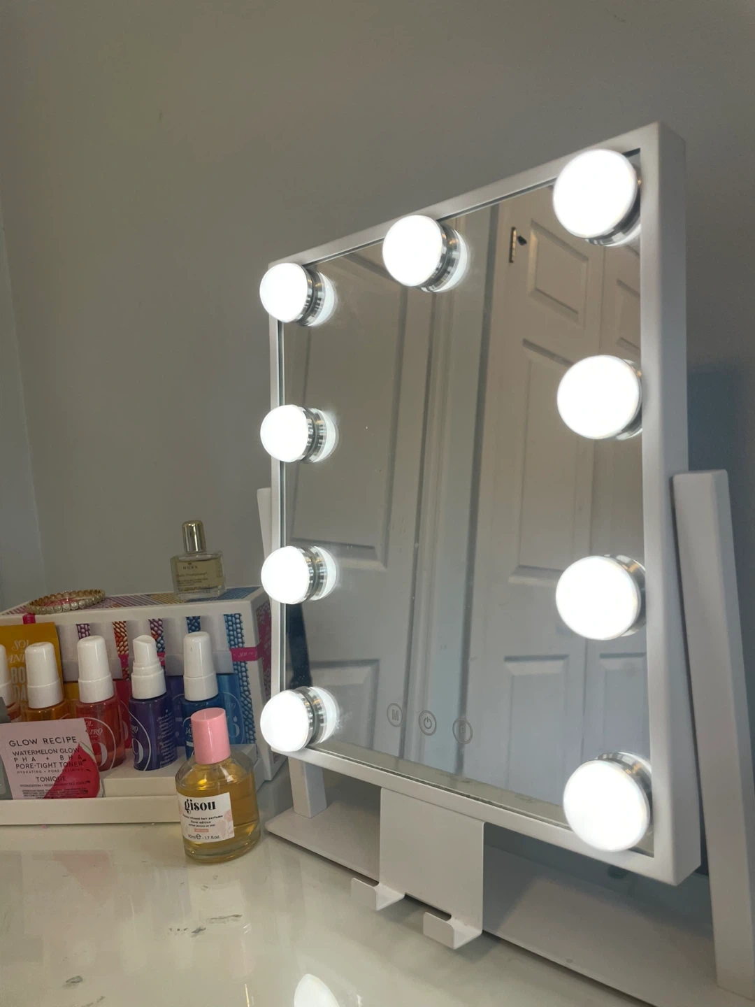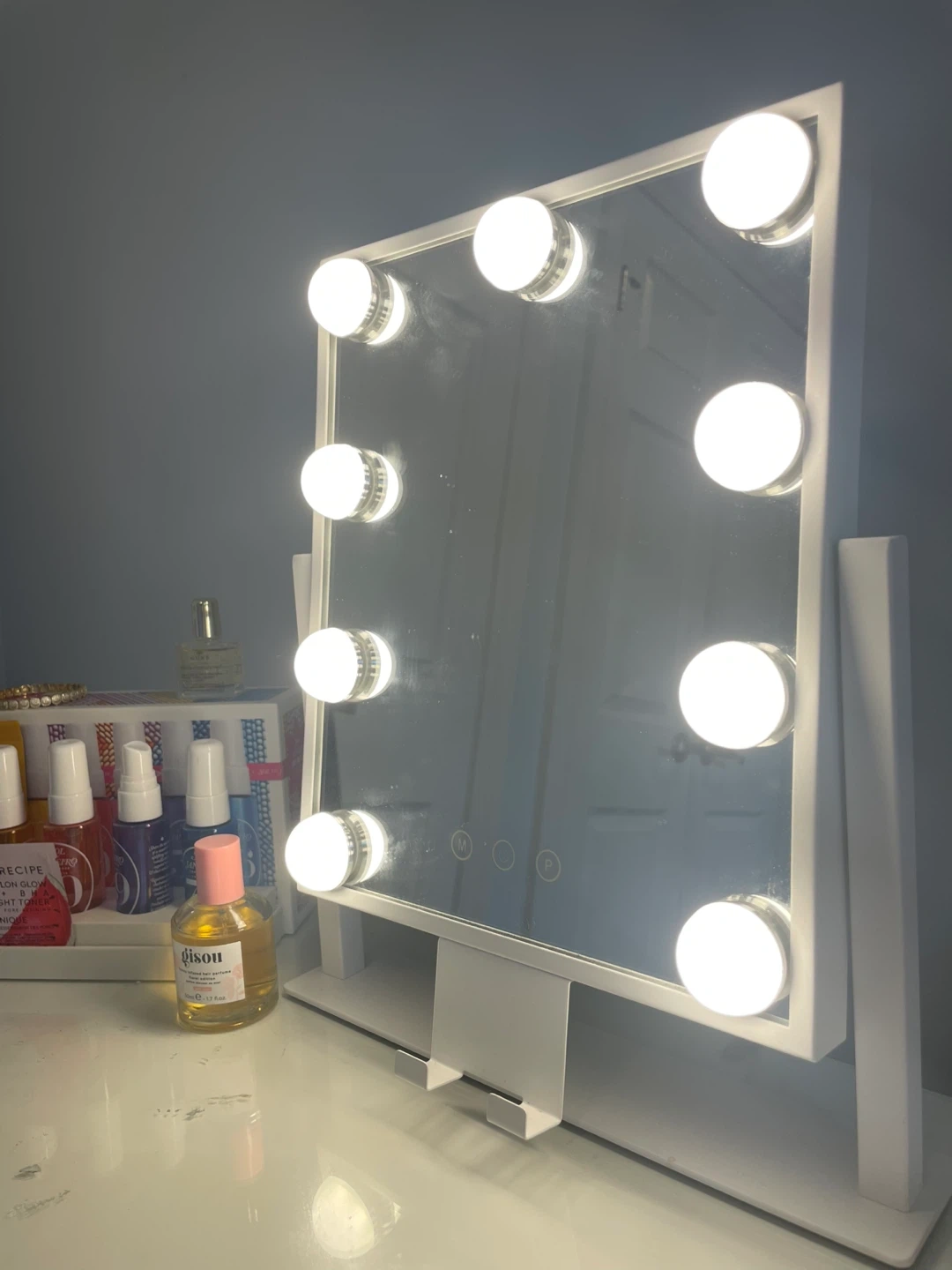 A white Hollywood-style vanity mirror featuring 10 bright LED bulbs. It has a stable stand for countertop use. Perfect for applying makeup or styling hair with proper lighting!