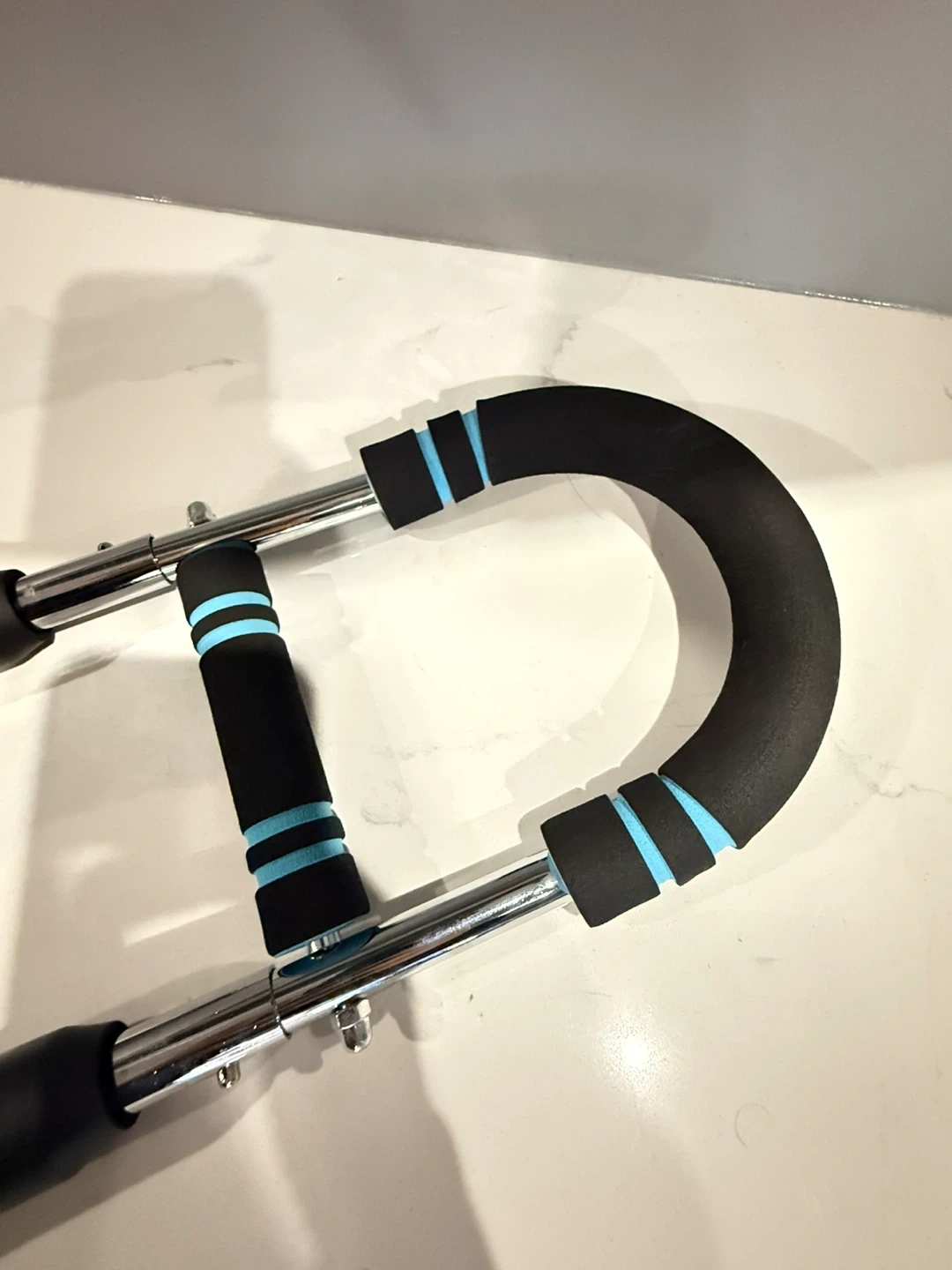 Durable core workout bar. Has comfy foam handles with blue accents. Great for ab exercises and building strength. Easy to use at home.
