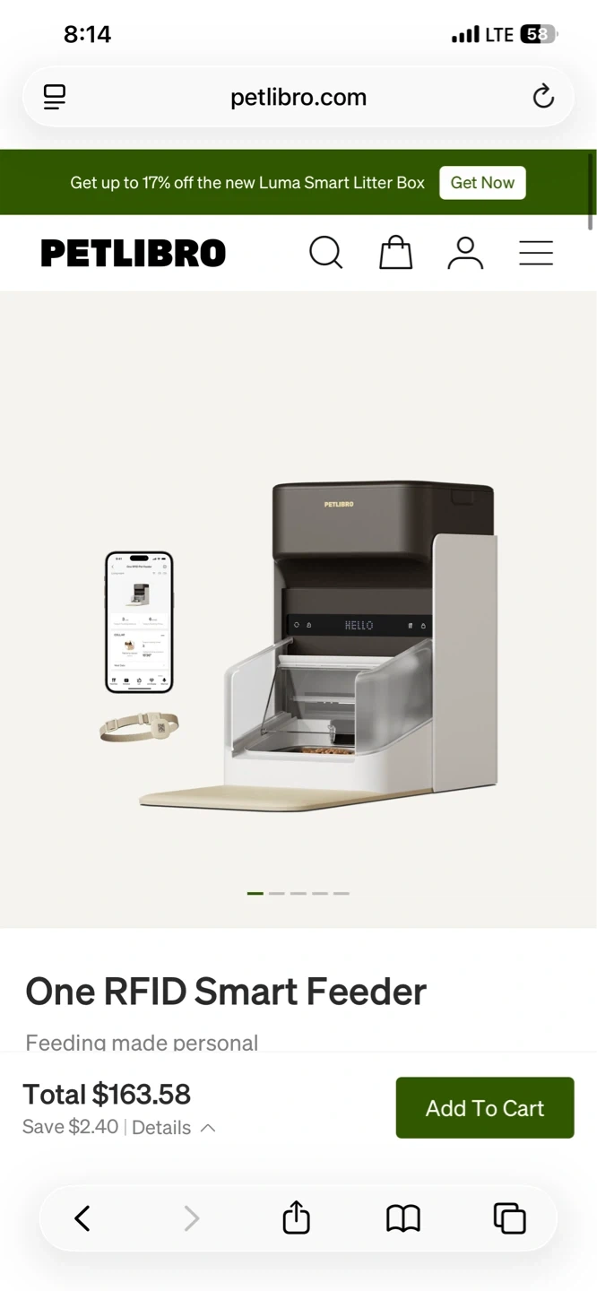 This is the PETLIBRO One RFID Smart Feeder. It's designed for personalized pet feeding. Includes RFID collar tag for accurate feeding. Will include Desiccant Bag