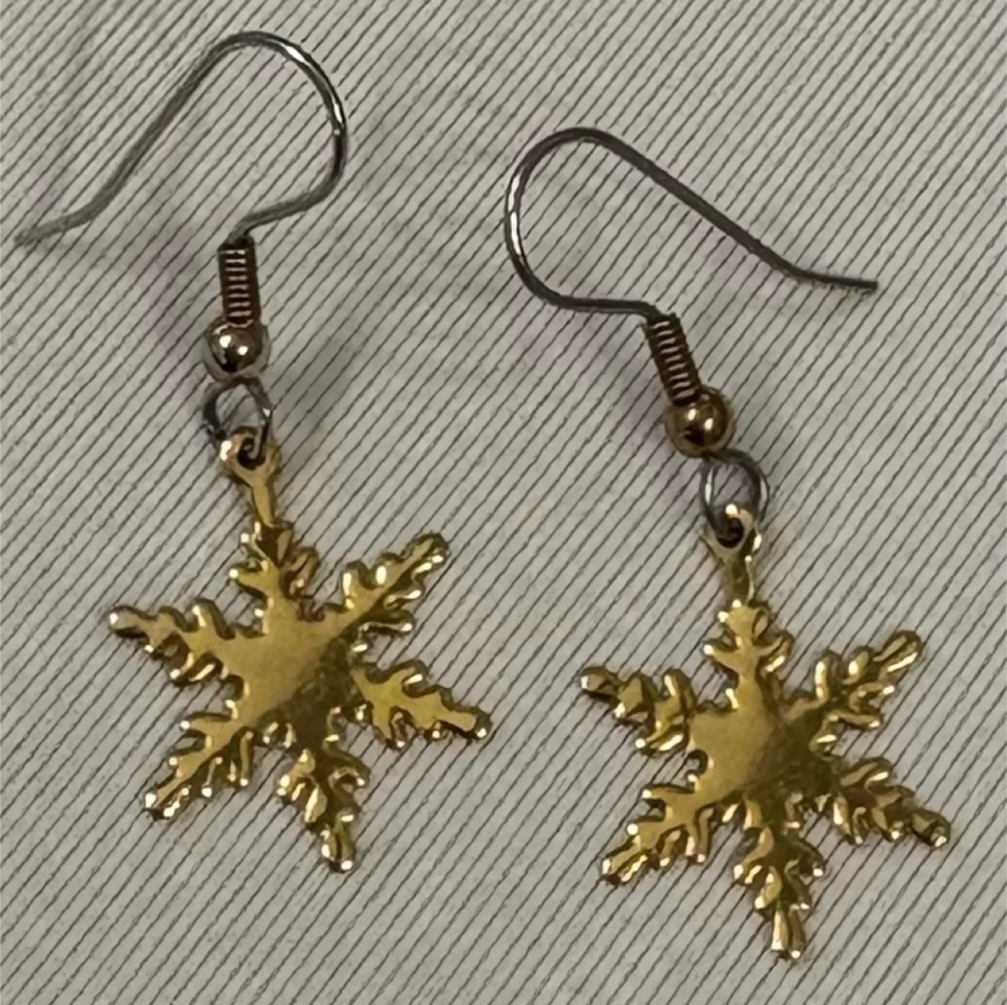 Snowflake earrings, gold tone, dangle earrings, winter jewelry, holiday accessories, Christmas, minimalist, delicate, shepherds hook, seasonal