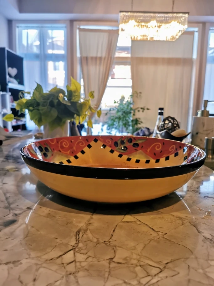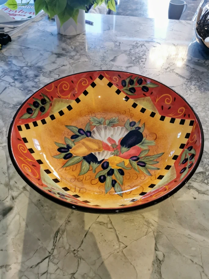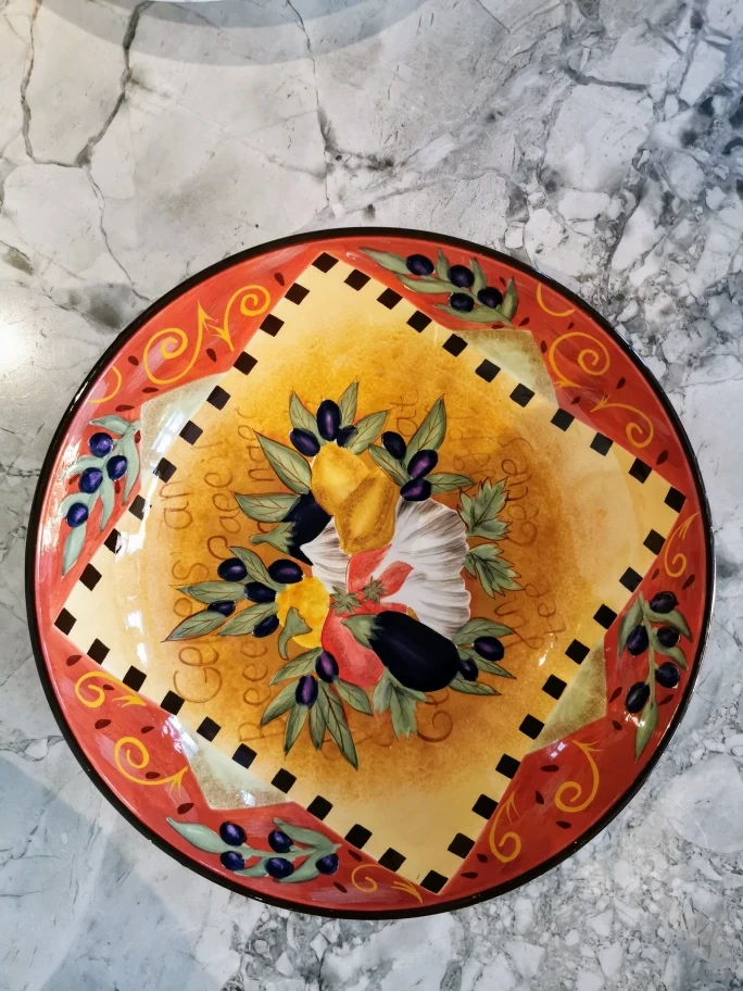 This is a lovely ceramic serving bowl with a vibrant Italian-inspired design. It features a colourful depiction of produce like olives, eggplants, tomatoes, and garlic. This bowl is perfect for serving salads or pasta dishes at your next gathering!