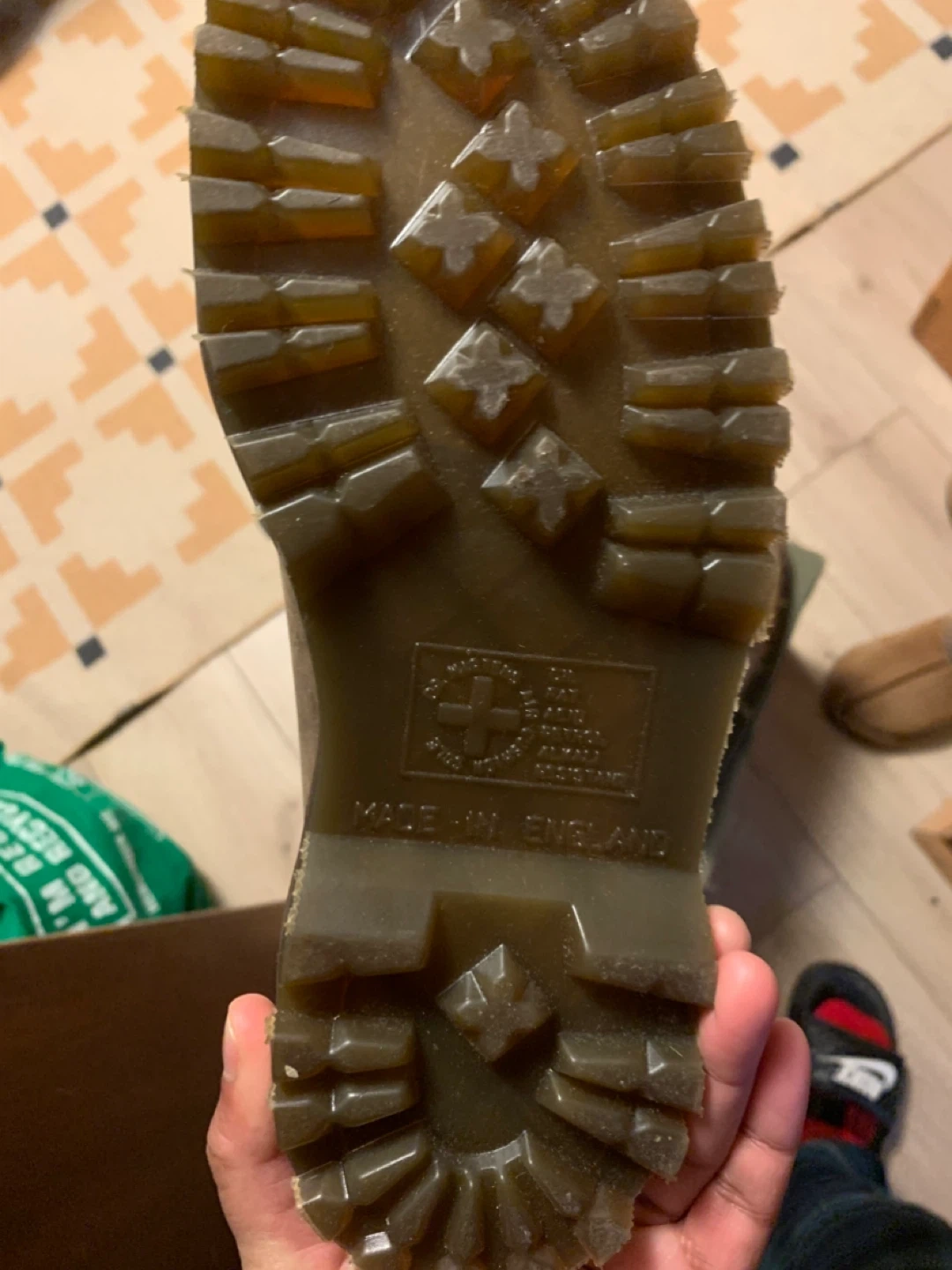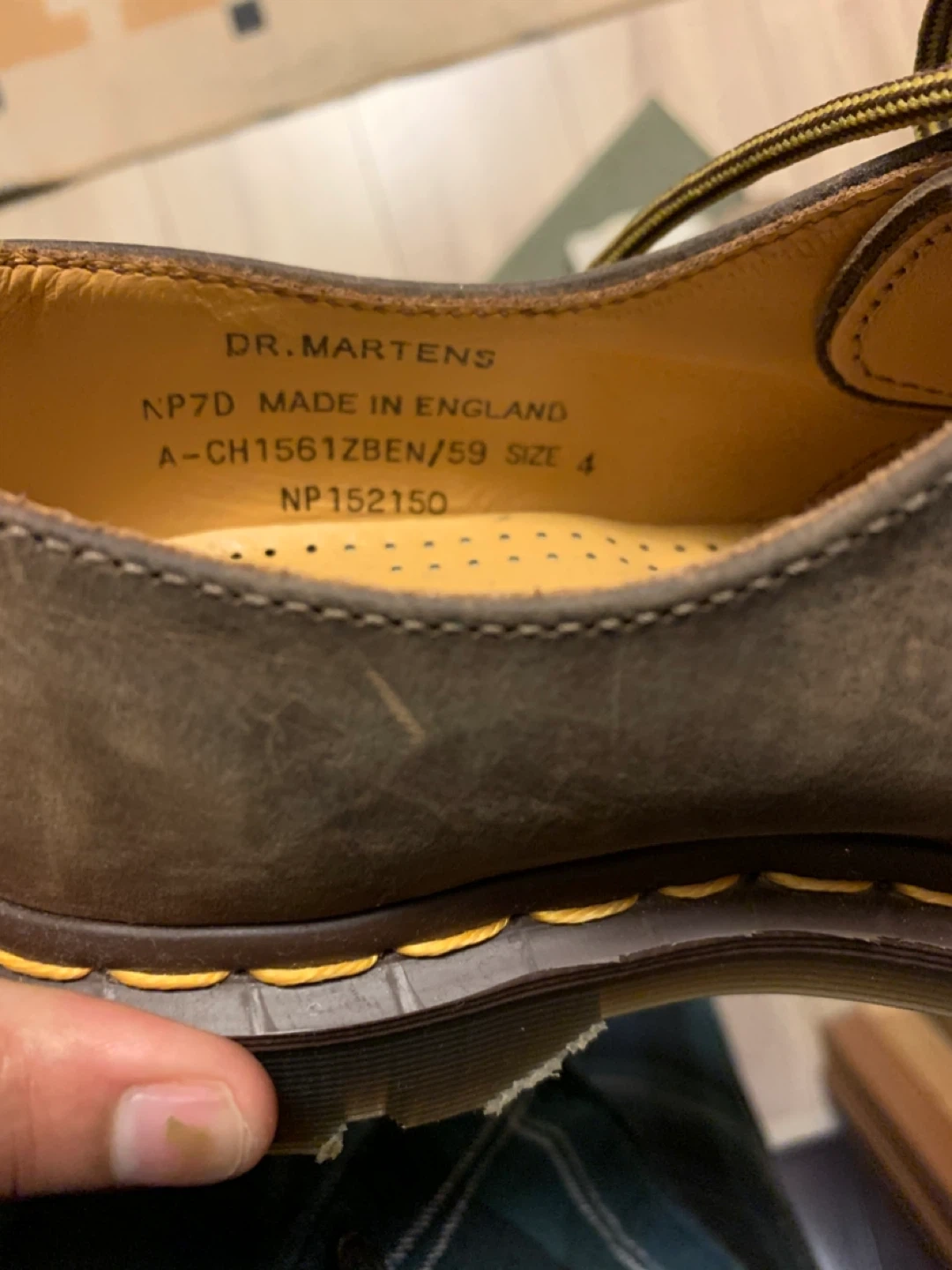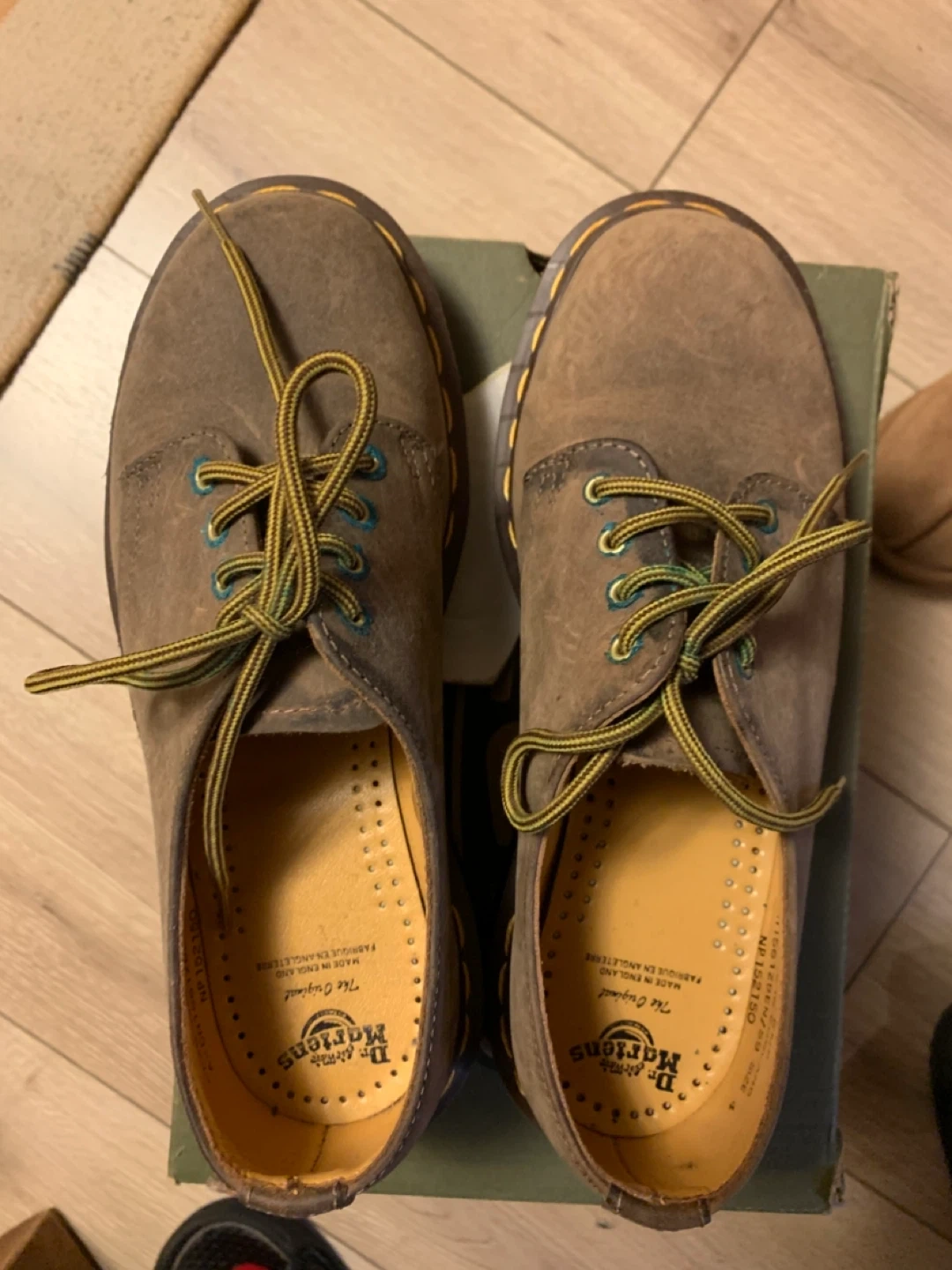 Dr. Martens brown suede shoes, made in England. These classic shoes are size 4 and come with original yellow laces. They're made of suede material with a durable sole.