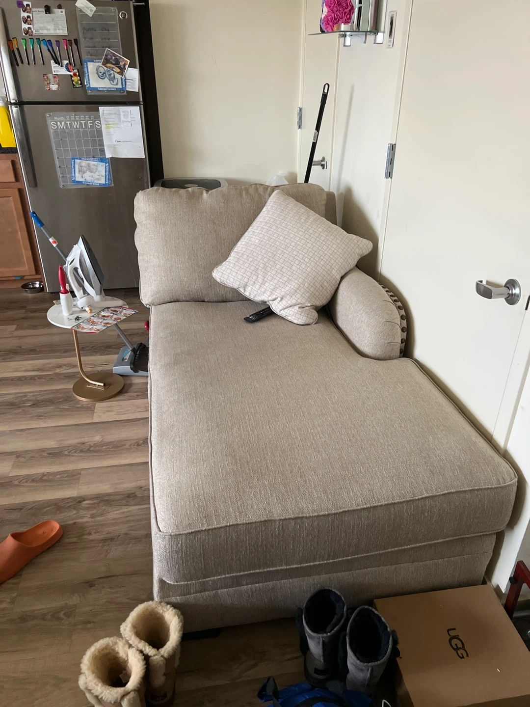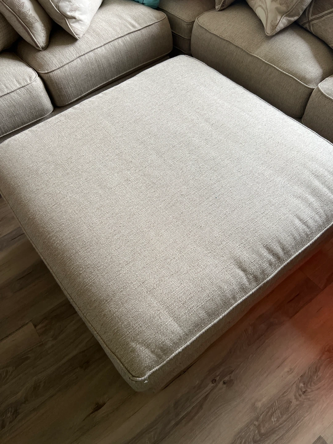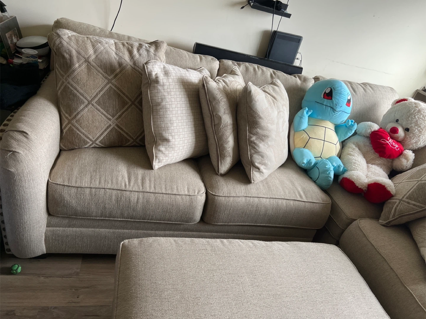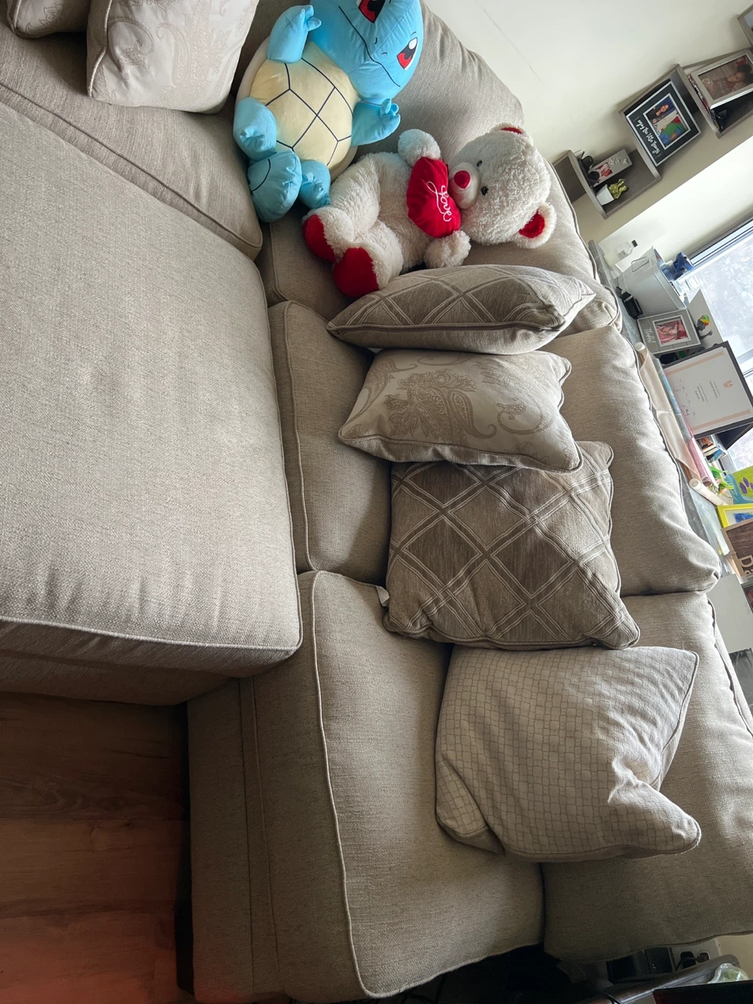 Selling a comfortable beige sectional sofa. It comes with several decorative pillows to complete the look. The sofa is in great condition and ready for a new home!