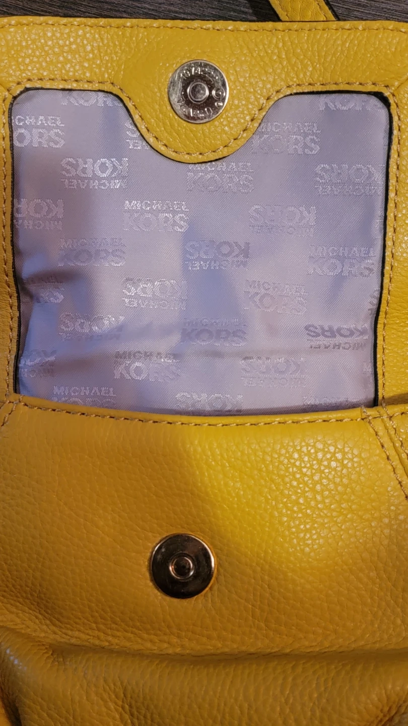 This is a gorgeous vibrant yellow Michael Kors crossbody bag. It's made of pebbled leather. The interior lining features the Michael Kors logo pattern.