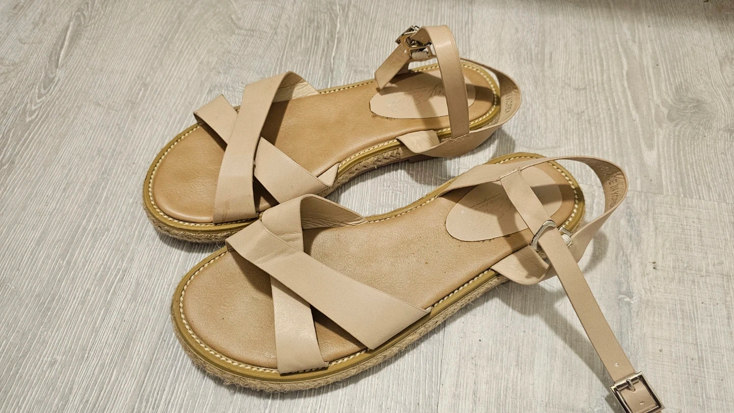 These stylish beige sandals feature a strappy design with an ankle buckle. They have a comfortable espadrille sole.