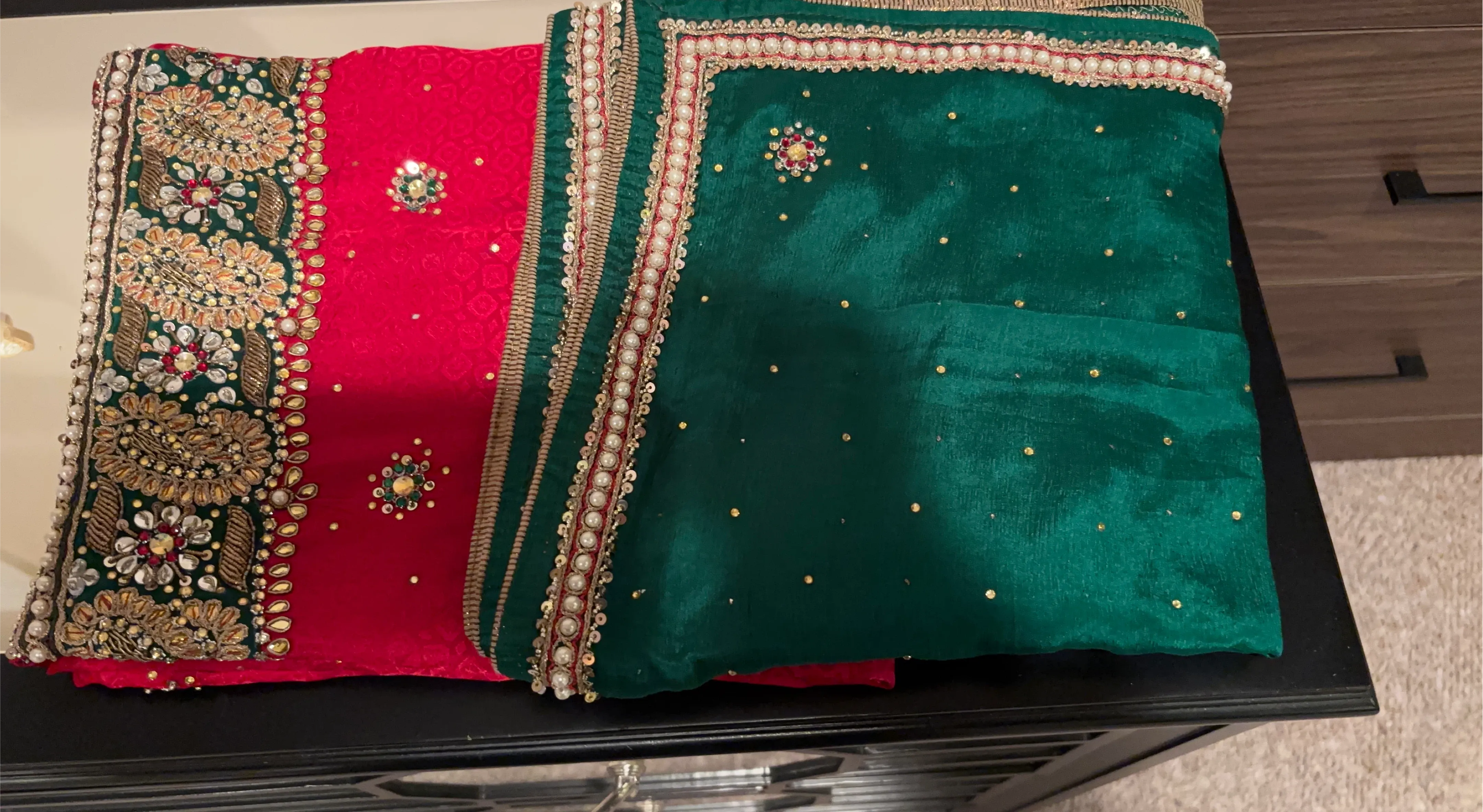 Beautiful suit in red and green with intricate embellishments! The fabric appears to be velvet or a similar soft material, adding a luxurious touch. Perfect for a special occasion or festive event