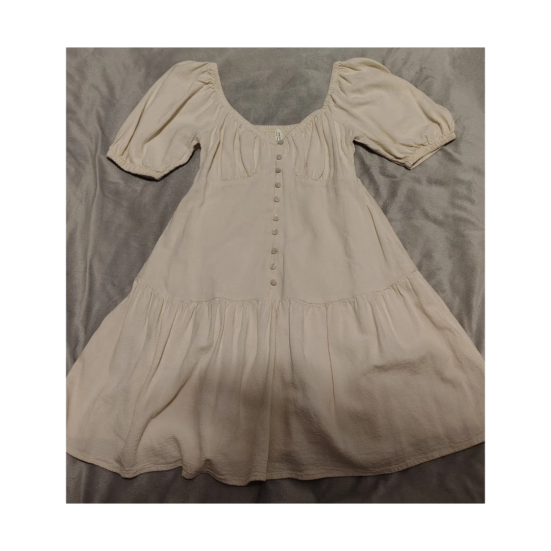 Cream-coloured tiered dress from American Eagle. It's a size XS with a shirred bust and button-up front. Puff sleeves add a nice touch!