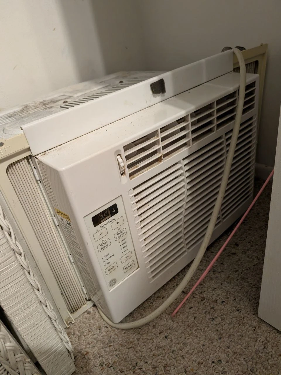 GE window air conditioner with multiple modes including cool, fan only, and eco. Features adjustable temperature and delay settings. Filter reset function included.