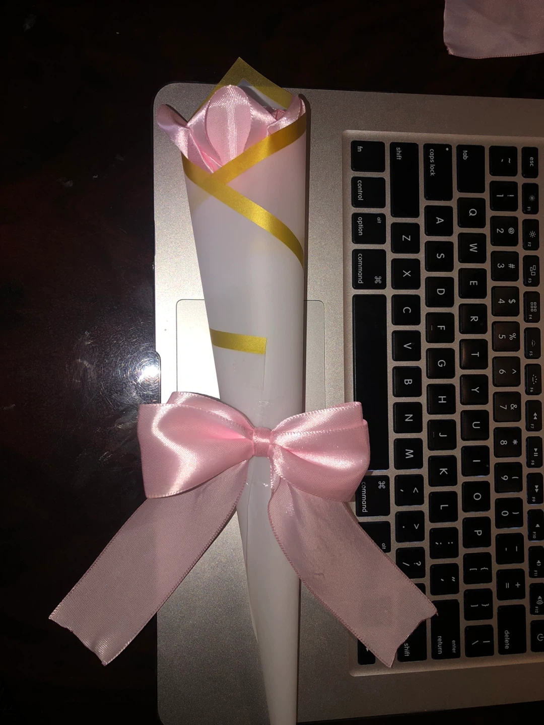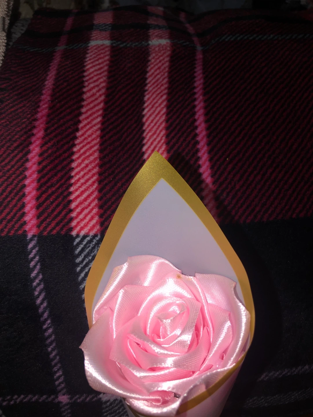 This is a single pink fabric rose. It's wrapped in white paper with gold trim and tied with a satin ribbon. Perfect for gifting or decoration! If you would want it without the bow then the price would be $6