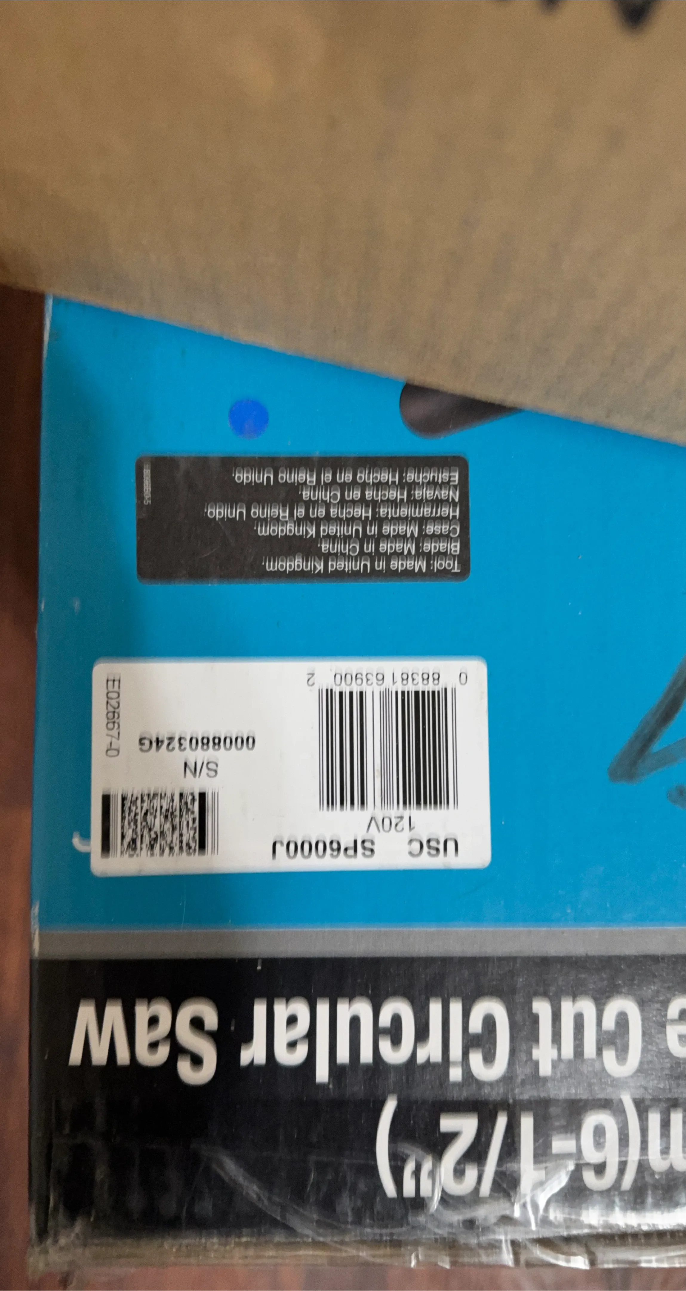 This is a USC SP6000J circular saw. It operates on 120V power. The tool and case are made in the United Kingdom, while the blade is made in China.