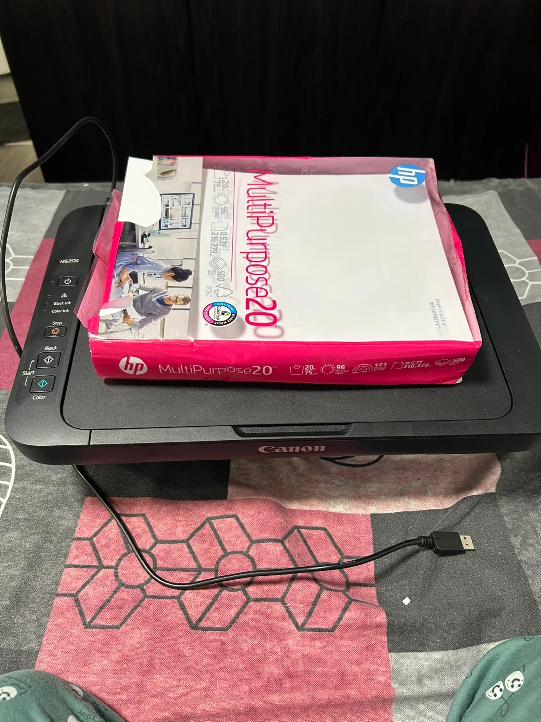 This Canon PIXMA MG2524 is an all-in-one printer, copier, and scanner. It's a compact and efficient device for your home or office needs. Included is a ream of HP multipurpose paper. Includes power cord and USB cable.