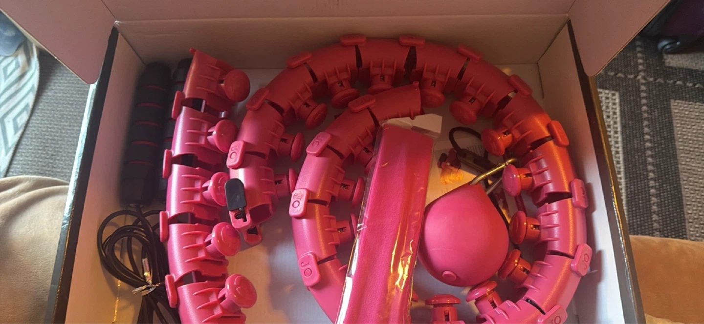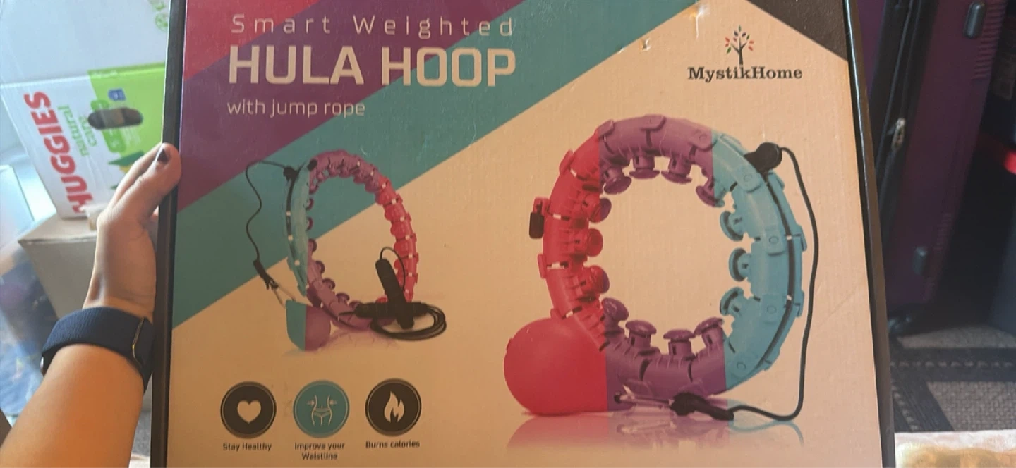 This is a MystikHome Smart Weighted Hula Hoop with an included jump rope. It's designed to help you stay healthy, improve your waistline, and burn calories. The hula hoop comes with adjustable segments for a customizable fit.