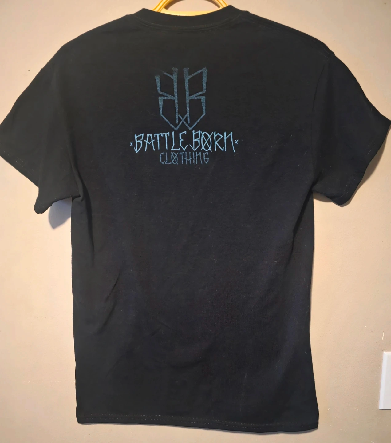 Black Gildan DryBlend t-shirt with battle rapper Dirtbag Dan's "DBD" graphic on the front and "Battle Born Clothing" on the back. It's a size Small. Made from a cotton-polyester blend.