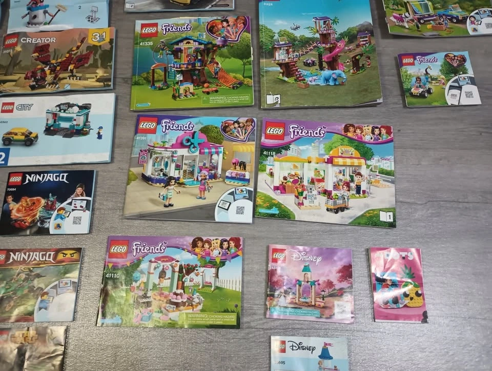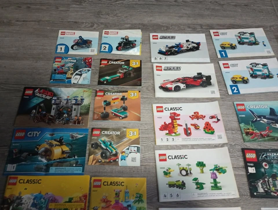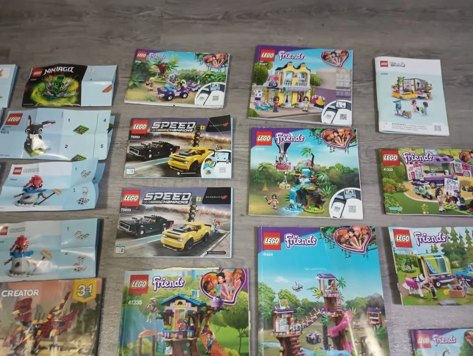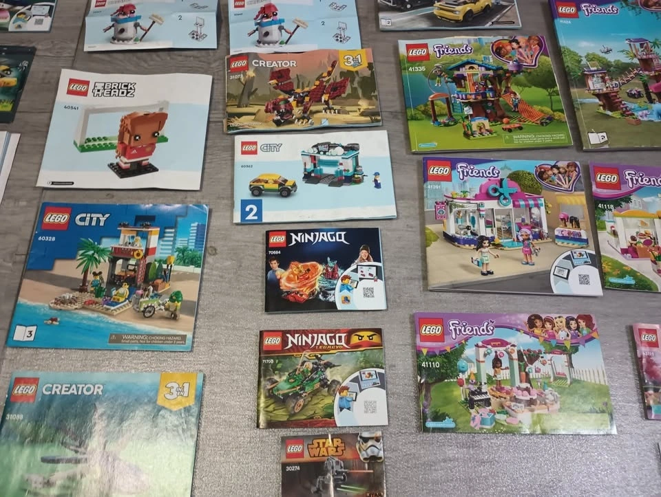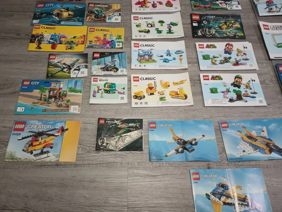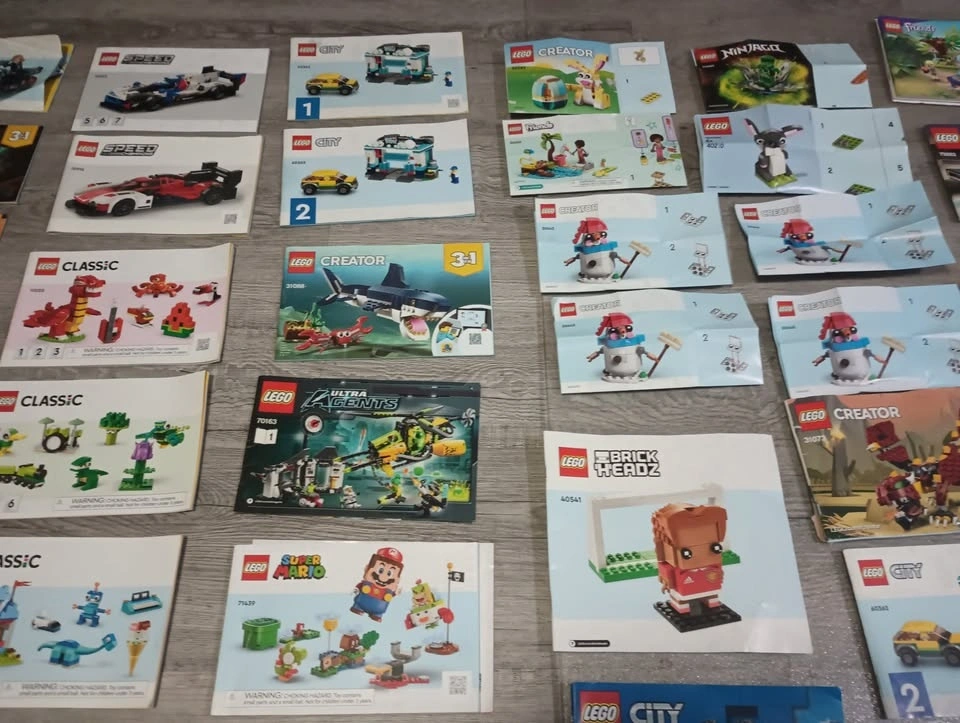 Large lot of 65 Lego building instruction manuals from various sets like Creator, Classic, Speed Champions, Super Mario, Friends, City and others. From a SF/BF home in Charleswood.