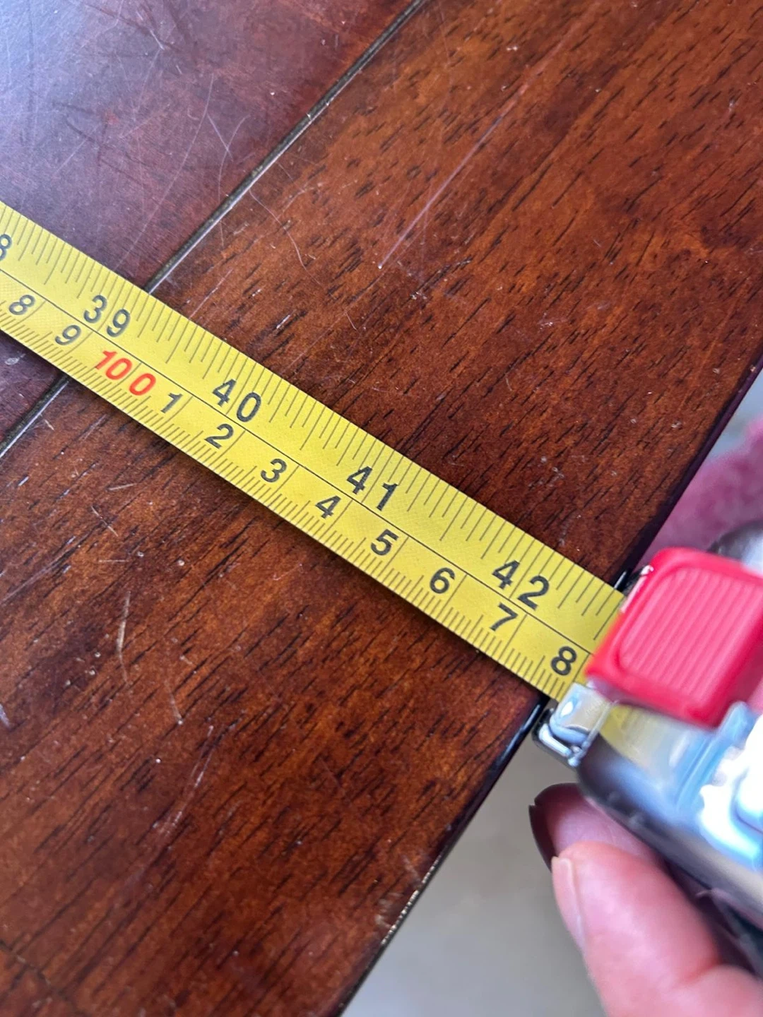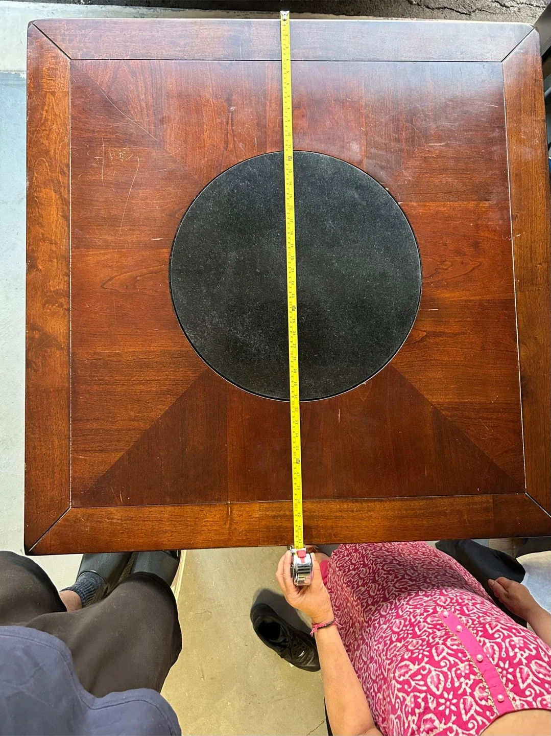 This dark wood dining table features a convenient drawer for storage. It has a central insert for added detail. The table measures 40 inches square.