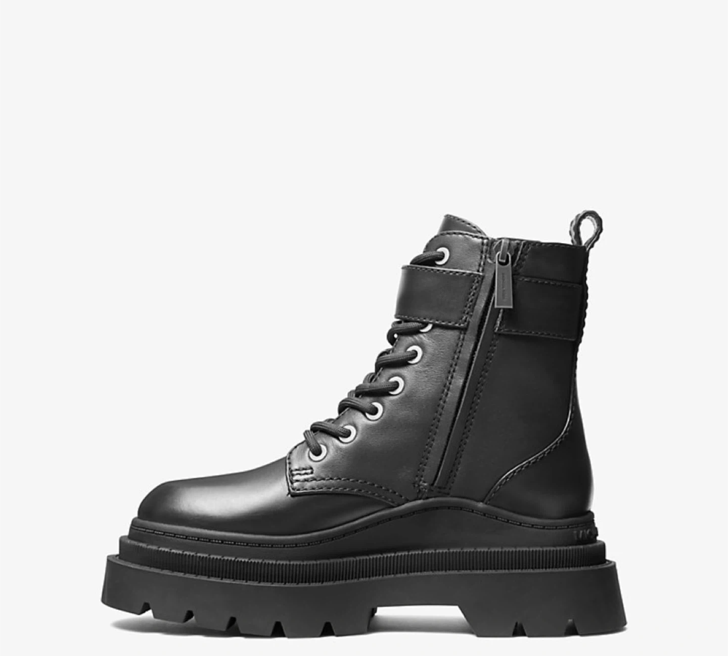 These black leather combat boots are from Michael Kors. They feature a lace-up front with a side zipper for easy wear. The chunky lug sole provides excellent traction.
