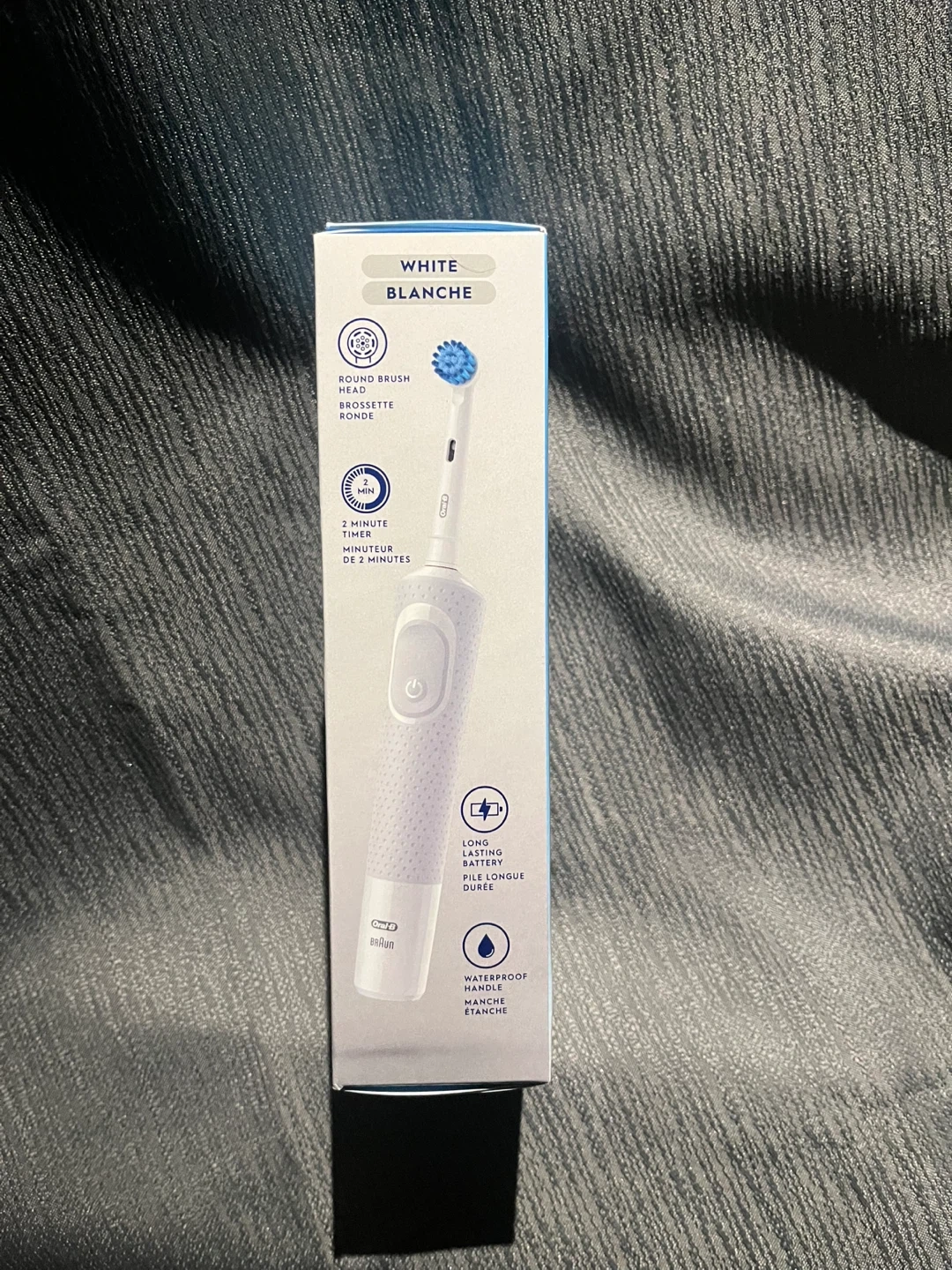 This is an Oral-B Pro 300 Vitality rechargeable electric toothbrush. It has a 2-minute timer and a waterproof handle. It provides a round brush for a deep clean.