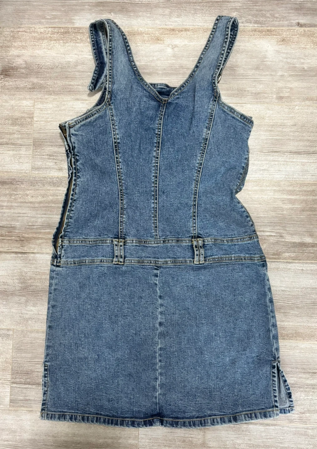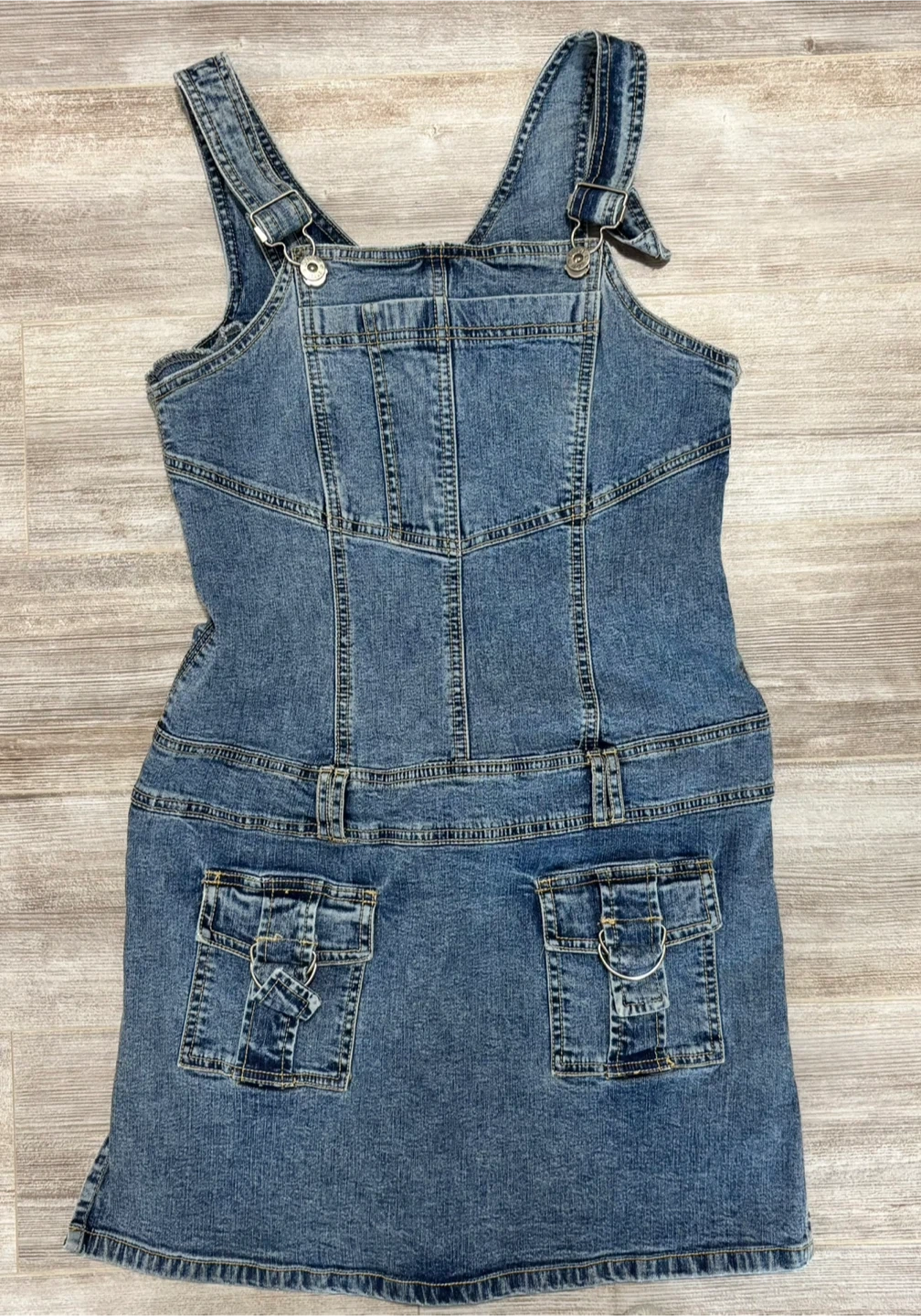 This Brody denim overall dress is a size medium. It's made of 98% cotton and 2% spandex. This dress is great for casual wear!