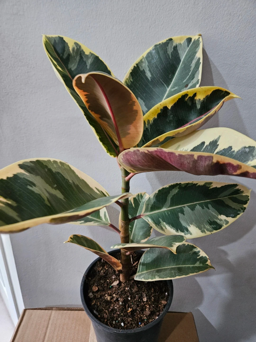 Beautiful Ficus Elastica Burgundy plant with tricolour leaves. This live plant comes in a black nursery pot. It's a great addition to any indoor space, adding a touch of greenery. The plant is healthy and well-established.