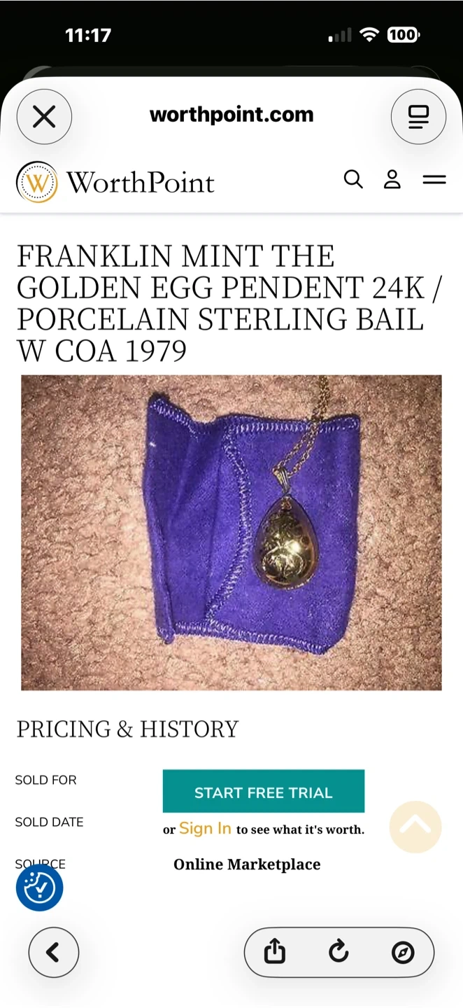 This is a Franklin Mint Golden Egg pendant. It features a 24K gold finish with a porcelain and sterling silver bail. A certificate of authenticity from 1979 is included! This unique piece adds a touch of vintage elegance.