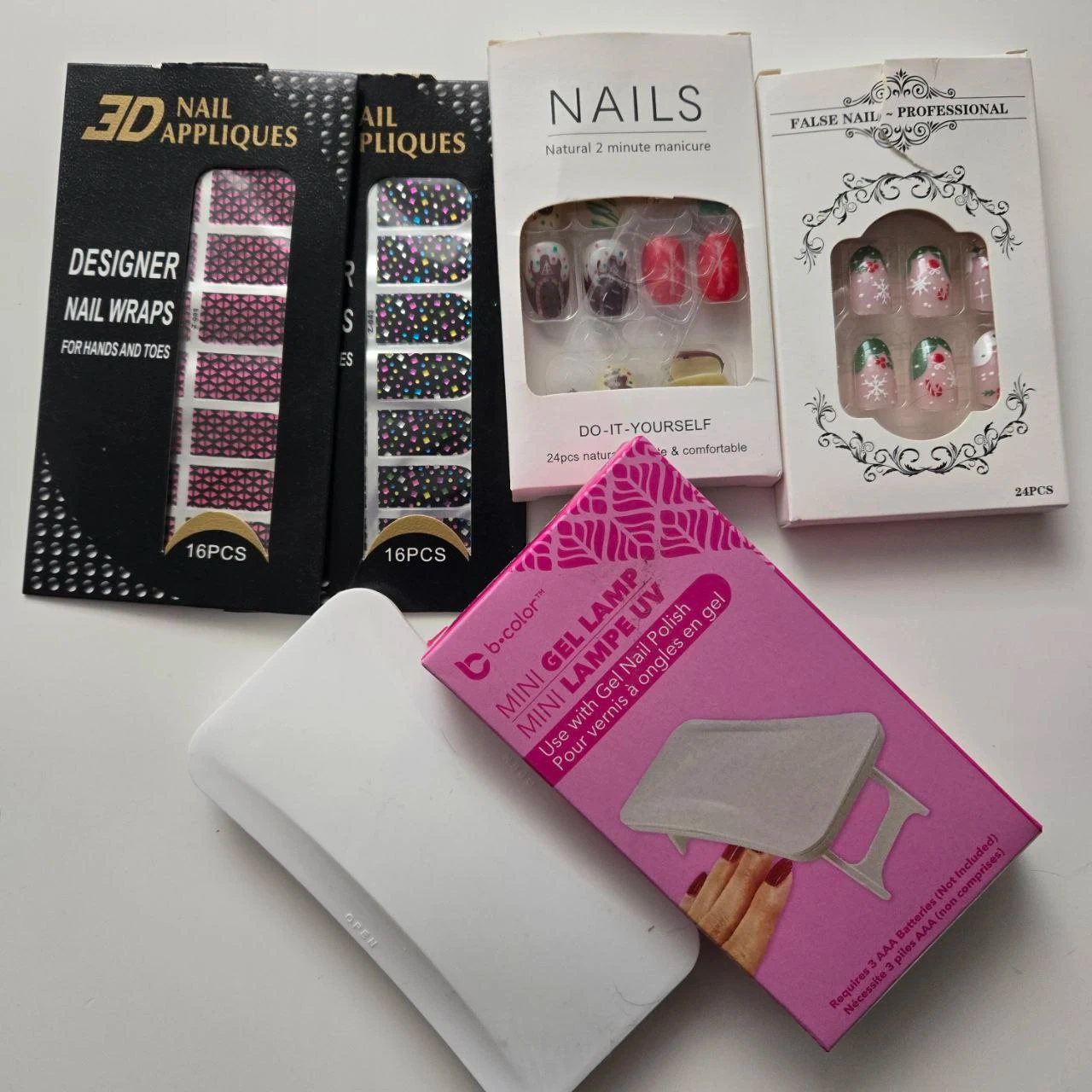DIY home manicure bundle including gel nail lamp and press-on nails.