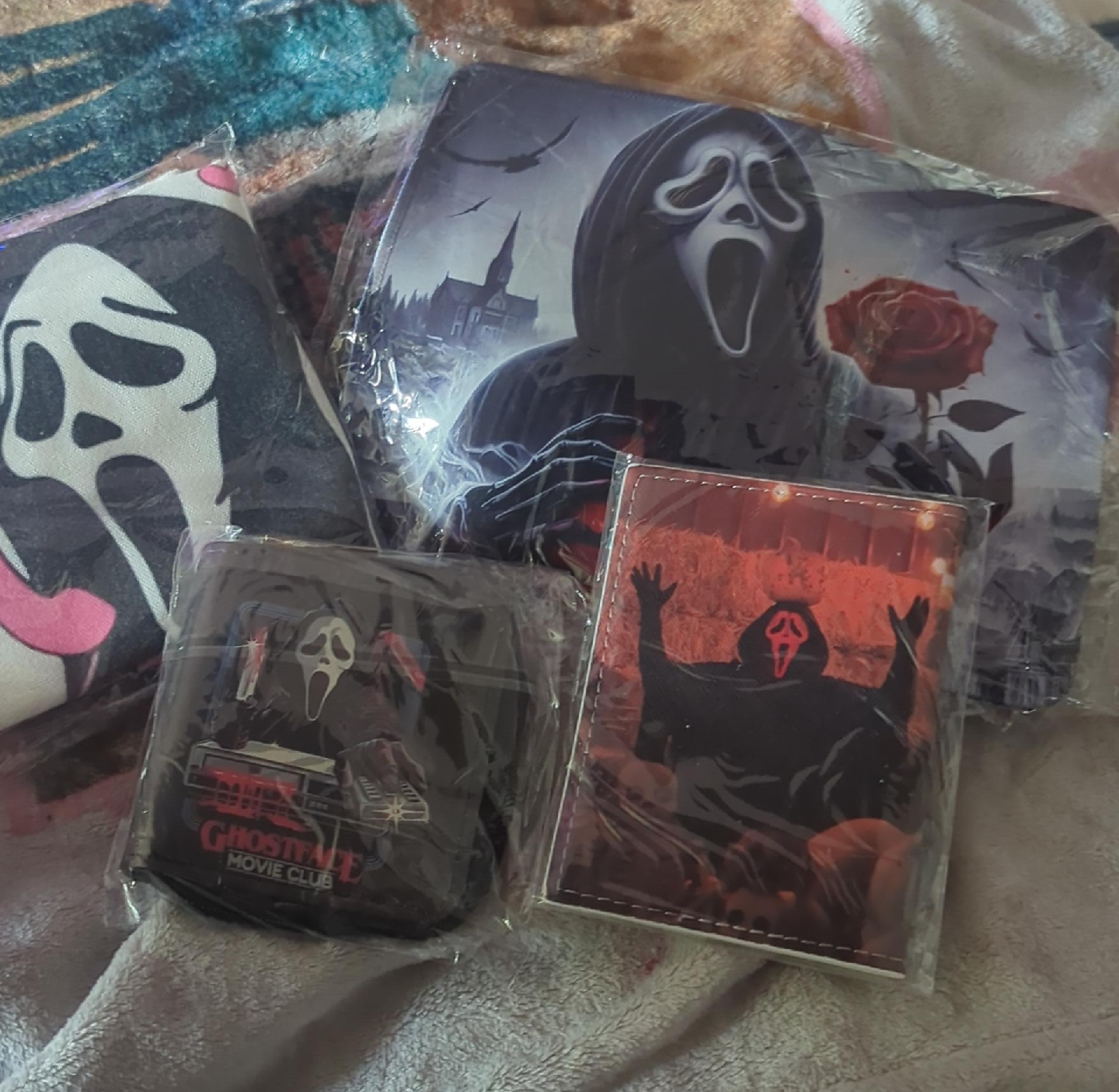 Selling a bundle of Ghostface/Scream merchandise! Includes a small bag, a wallet, and two other items with Ghostface designs. All items are still sealed in their original packaging