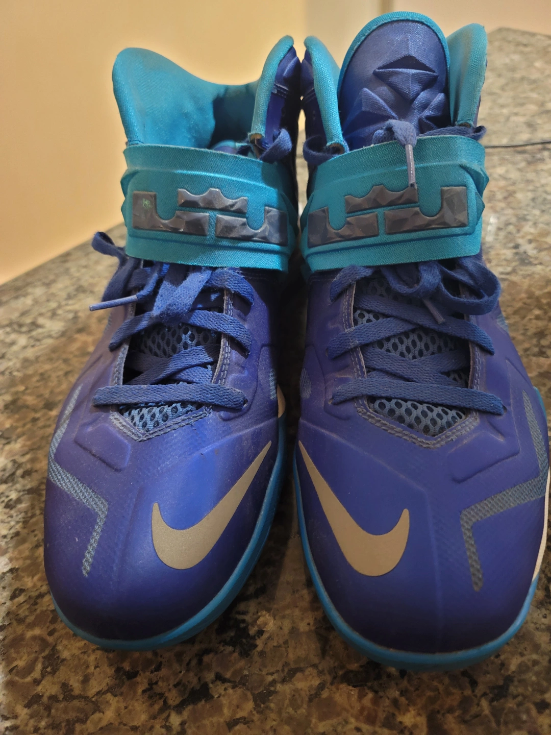 Men's Nike LeBron Soldier VII basketball shoes. Blue and turquoise colourway. Mid-top design with a strap. Used condition. Good for casual wear or on the court. Sz 12. No Box p/u only.