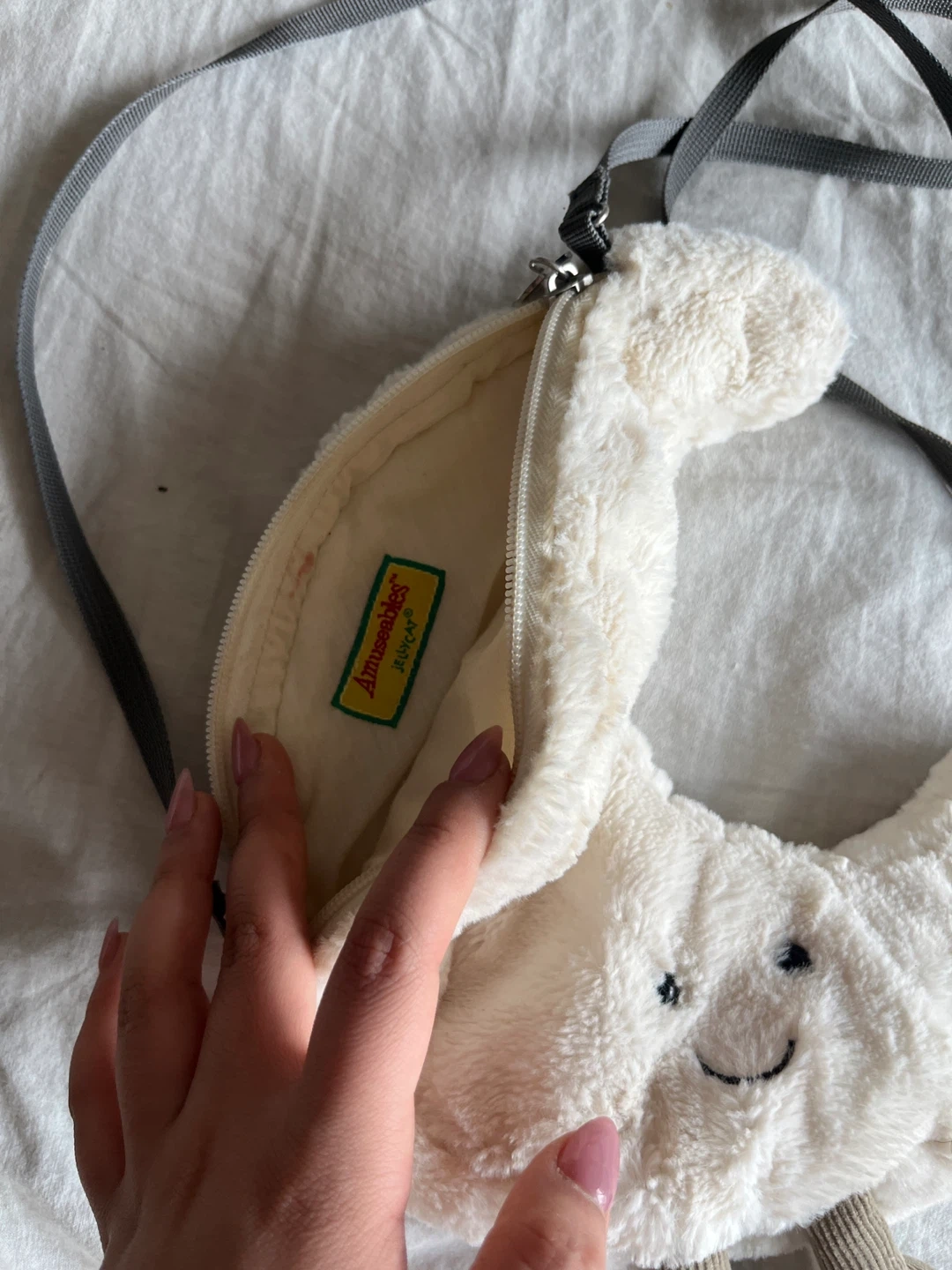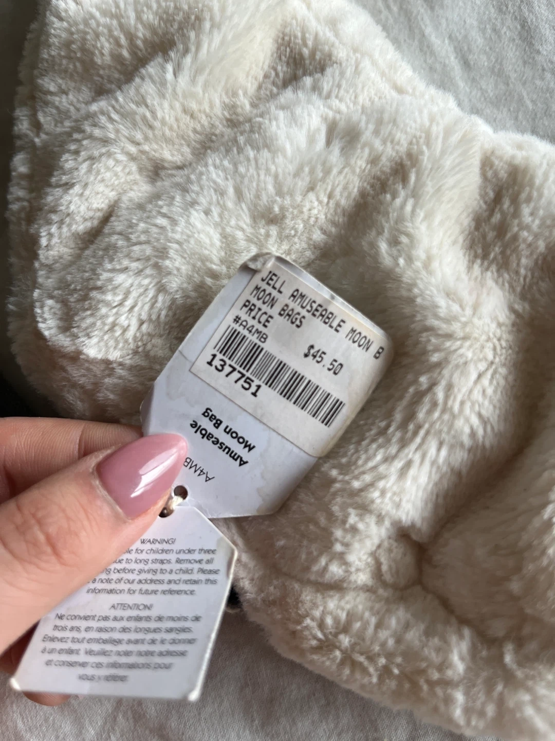 Cream fuzzy moon-shaped bag with a smiley face and dangling legs. It has a zipper closure and an adjustable strap. Perfect for little ones to carry their treasures! Bought for 45$ tax. No low balling on jelly cat. I just dont use it anymore.