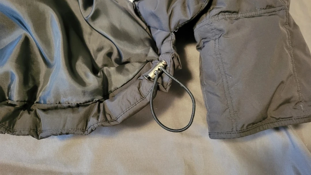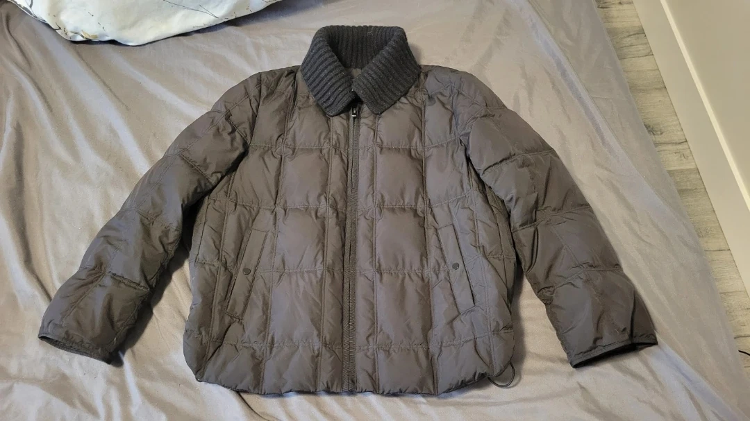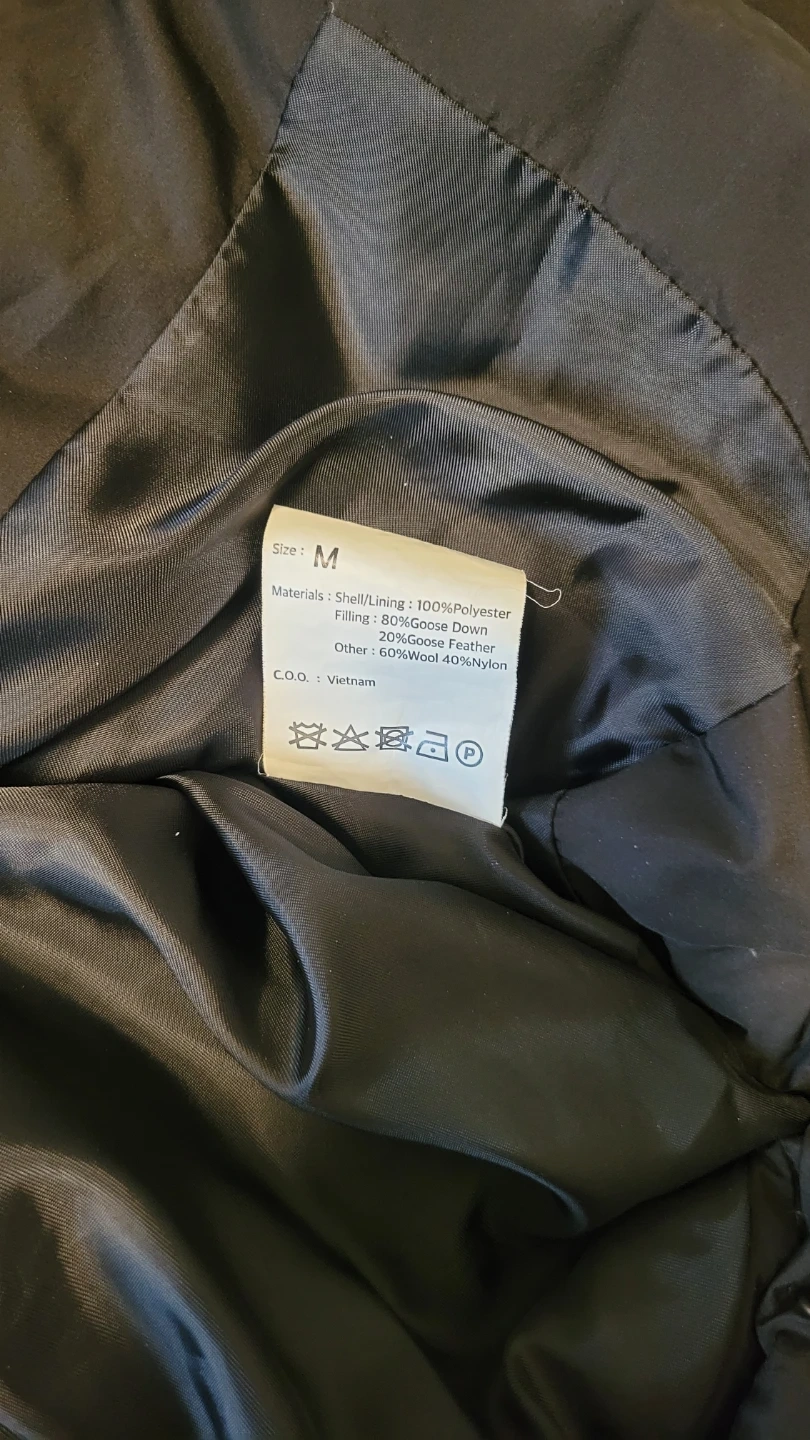 The filling is 80% goose down and 20% goose feather, with other components being 80% wool and 40% nylon. This jacket is great for keeping warm during colder weather!