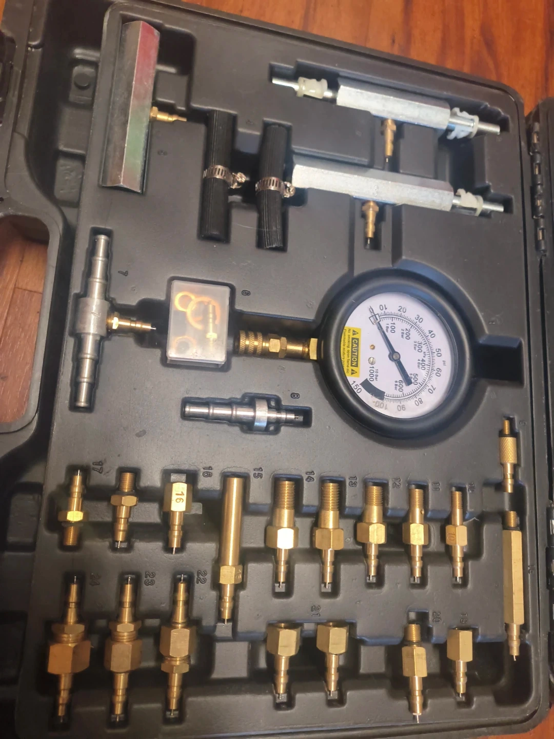This is a vacuum pump and brake bleeder test kit. It includes a pressure gauge and various adapters. Components are housed in a durable carrying case.