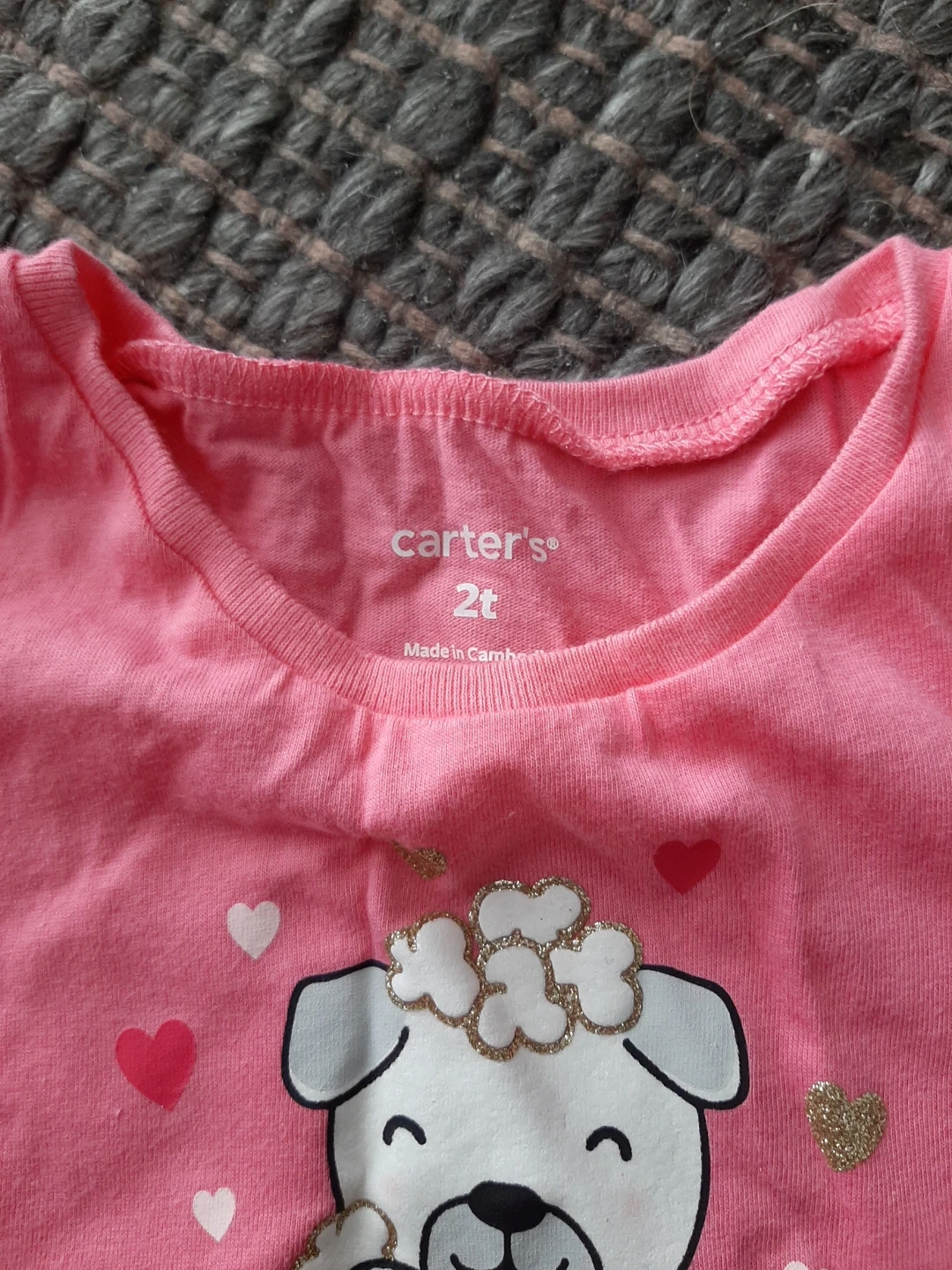 Carter's pink long sleeve t-shirt for toddlers. It features a cute puppy in a popcorn box graphic on the front with hearts and glitter accents. Size is 2t.