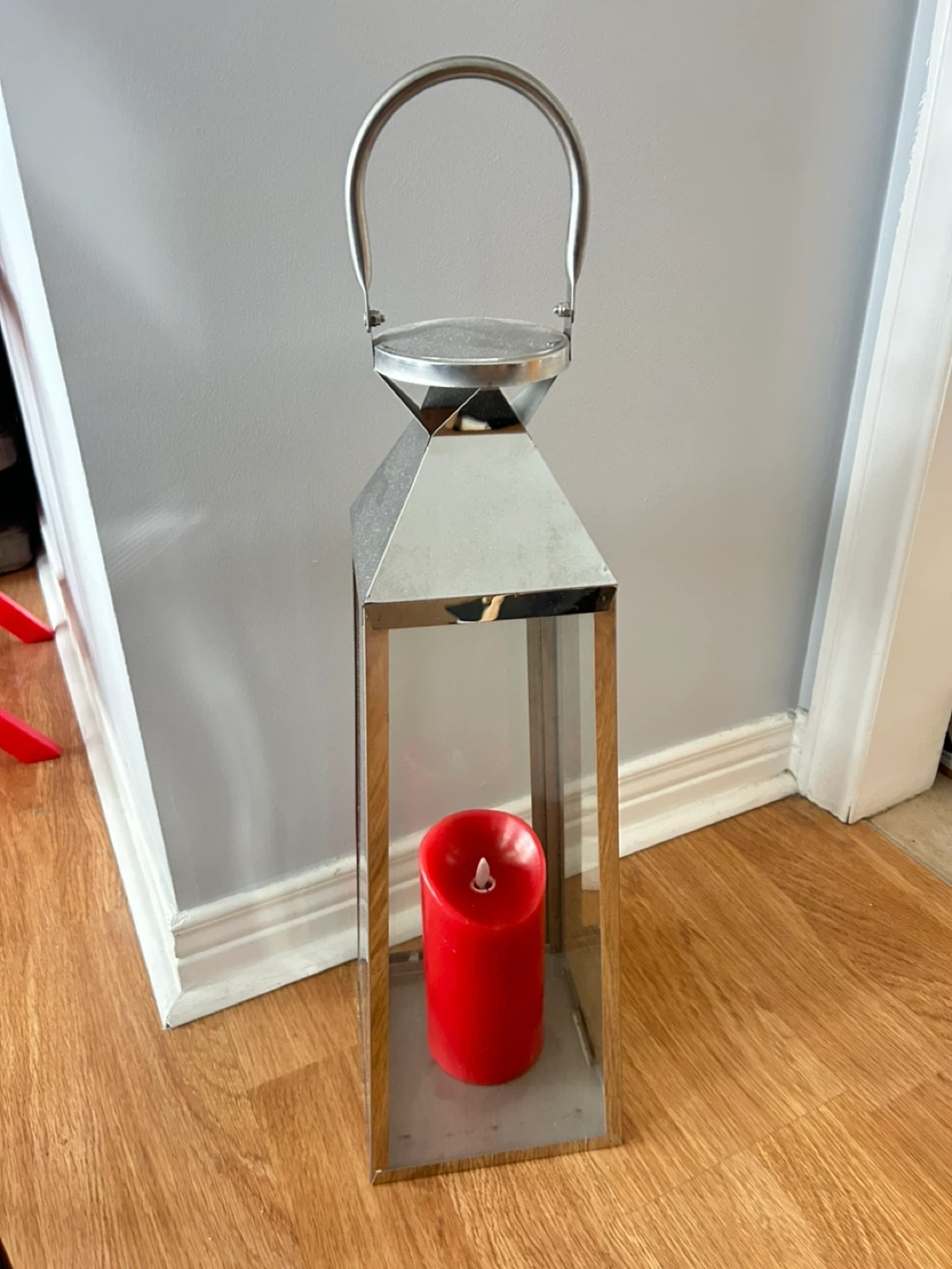 Silver-toned metal lantern with glass panels. It includes a red LED candle for illumination. This lantern's sleek design makes it a nice accent piece.