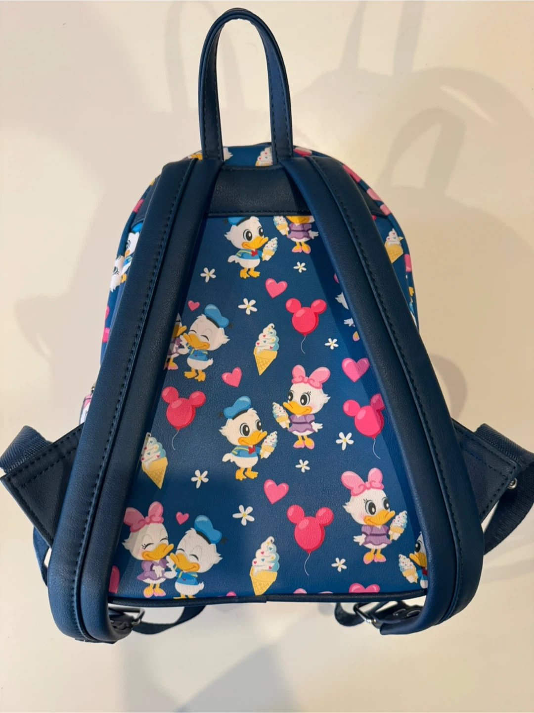 This Loungefly mini backpack features a fun print of Daisy and Donald Duck with ice cream and balloons. It's made of faux leather with adjustable straps and a zippered main compartment. Perfect for Disney fans!