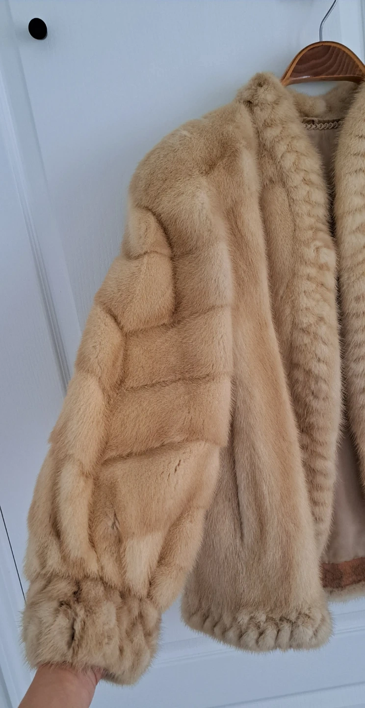 Beautiful tan/cream colour fox mink fur coat with a collarless design. It's a One of a kind elegant mink.