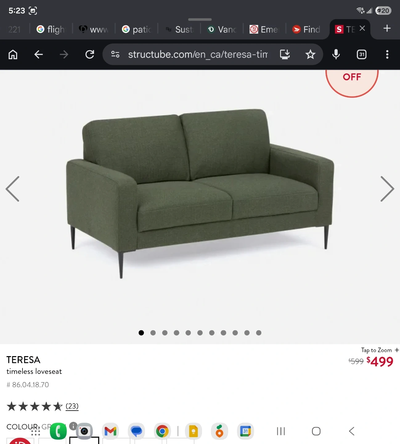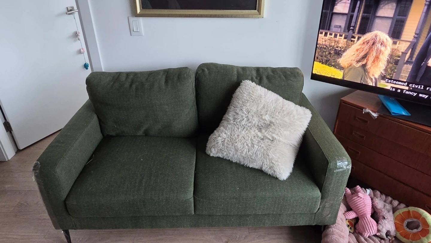 Structube TERESA timeless loveseat in a deep green colour. Width is 86 cm (34"), height is 86 cm (34"), and depth is 152 cm (60"). Sturdy frame and premium upholstery ensure everyday durability and lasting elegance. 1 year old but one arm (see image) is a little stratched and worn as it was covered with scratch prevent tape after the fact. No other damage. Smoke-free home. (But I do have a cat- if you have allergies). The back can be removed for travel. Retails for $500. Moving to smaller place.