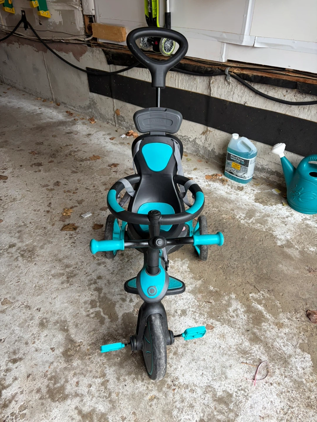 This adaptable tricycle is designed for young children, featuring a comfortable seat with safety restraints and a parent push handle. It's a great way for little ones to enjoy outdoor adventures as they grow. The teal and black colours add a stylish touch.