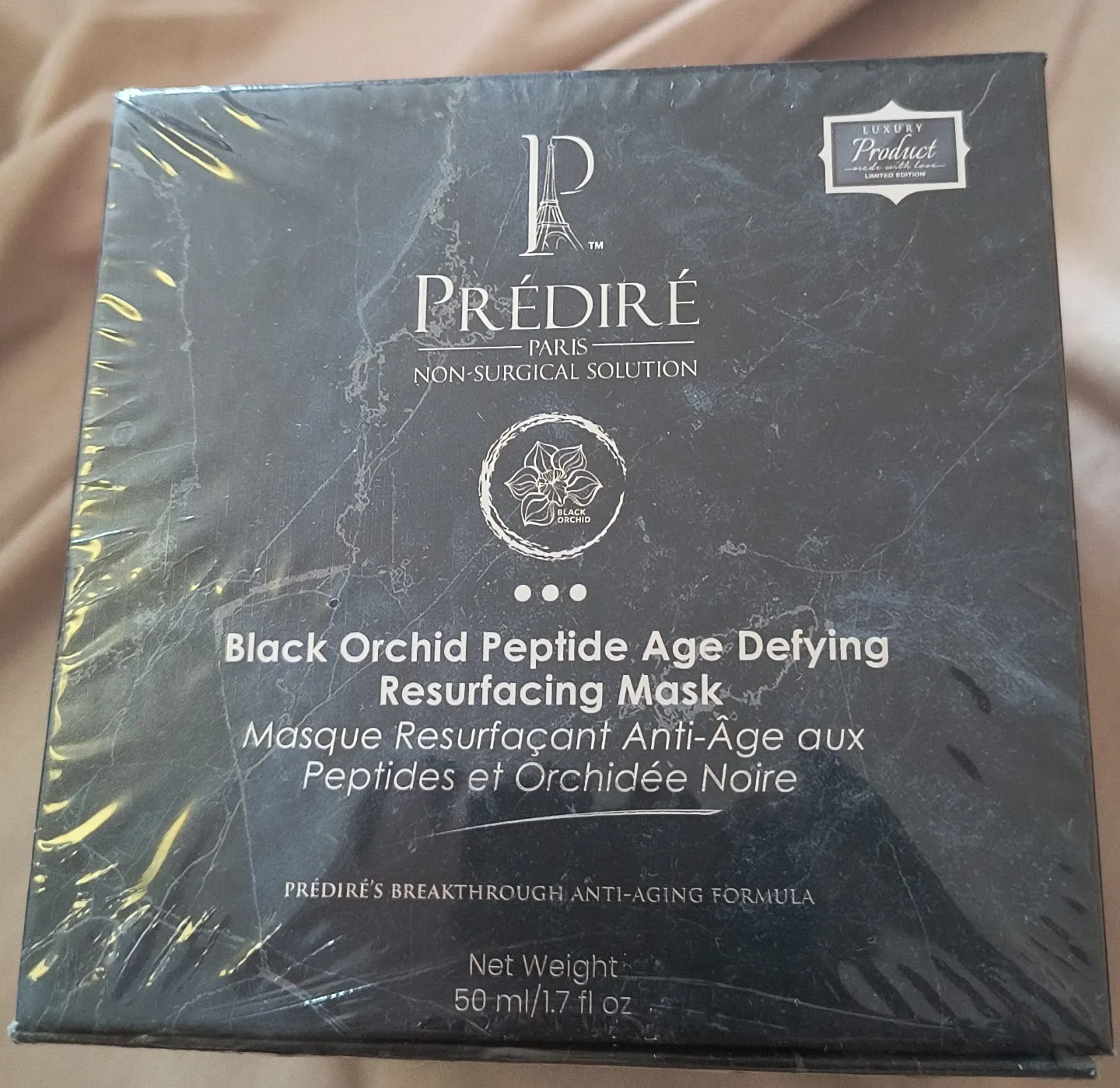 This is the PRÉDIRÉ PARIS Black Orchid Peptide Age Defying Resurfacing Mask. It's a non-surgical solution for age-defying skin. The mask has a net weight of 50 ml or 1.7 fl oz. It's an anti-aging formula designed to resurface the skin.