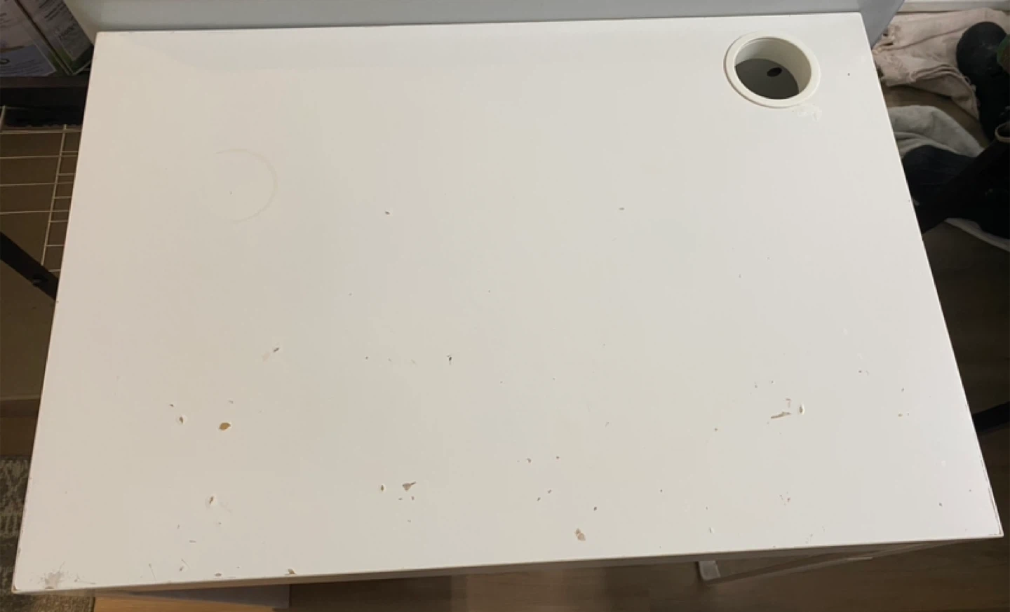 A simple white desk with a built-in drawer and a convenient cable management hole. It's suitable for a study space or a smaller office.