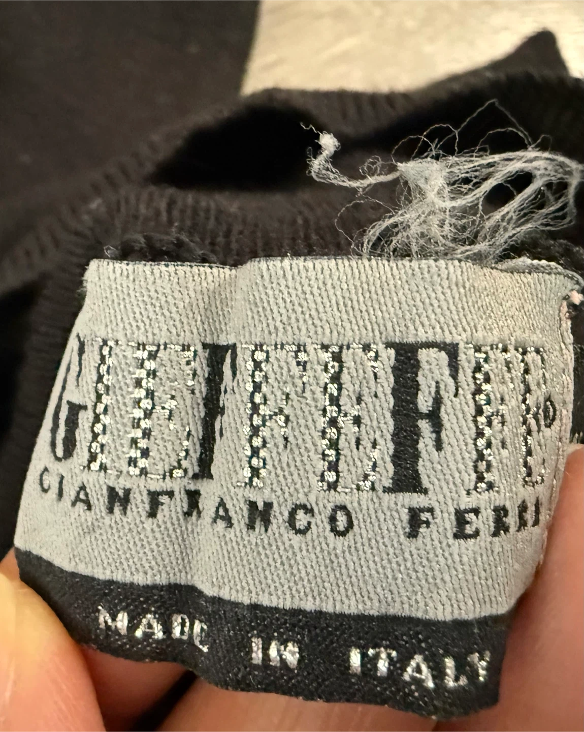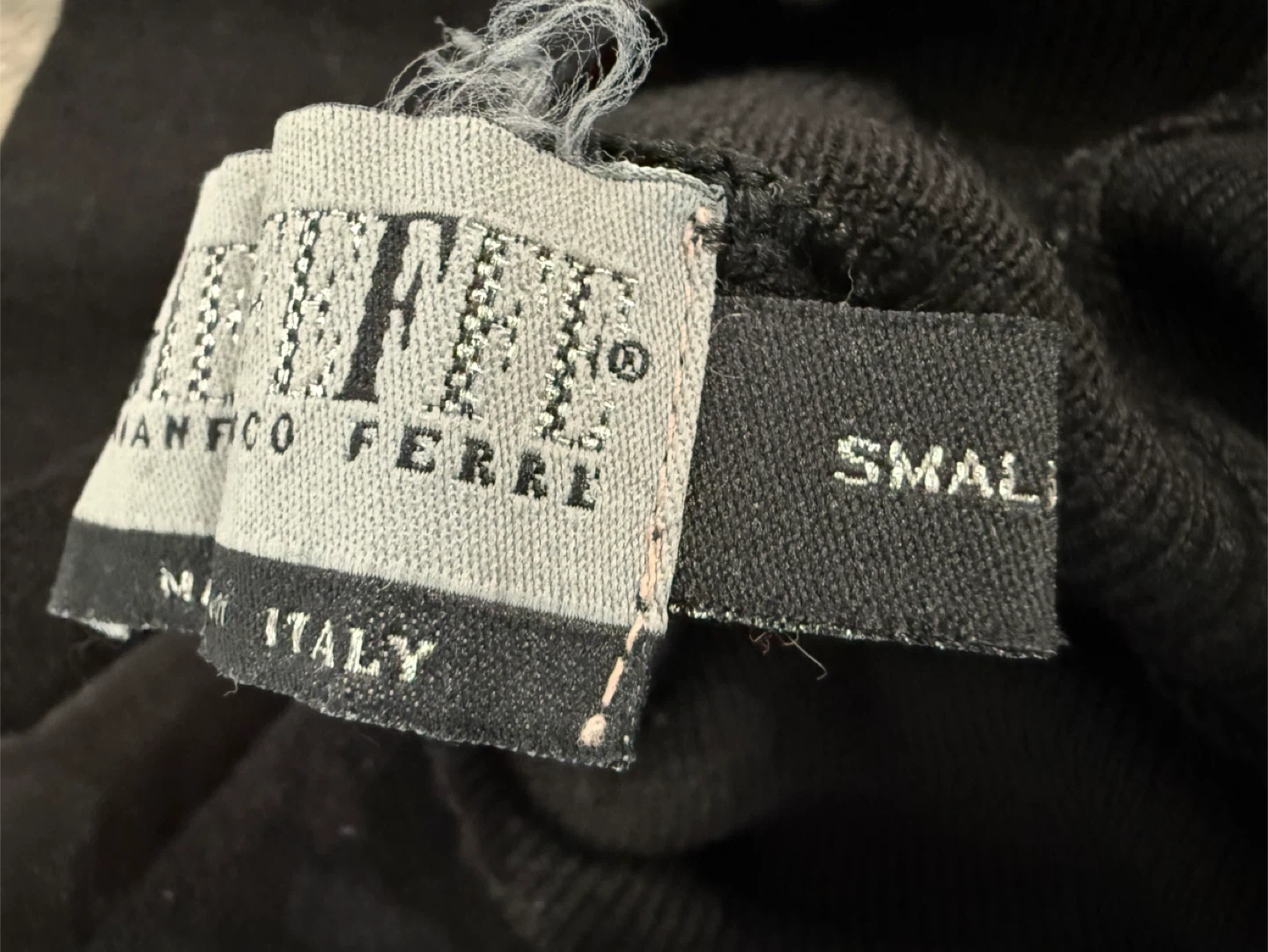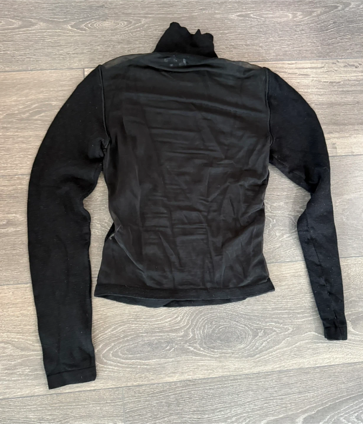 100Selling a black long-sleeved top from Gianfranco Ferre. It's a size small and has a unique design with sheer panels. Perfect for layering or wearing on its own! Small fit