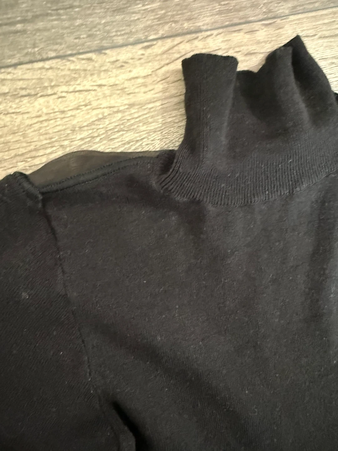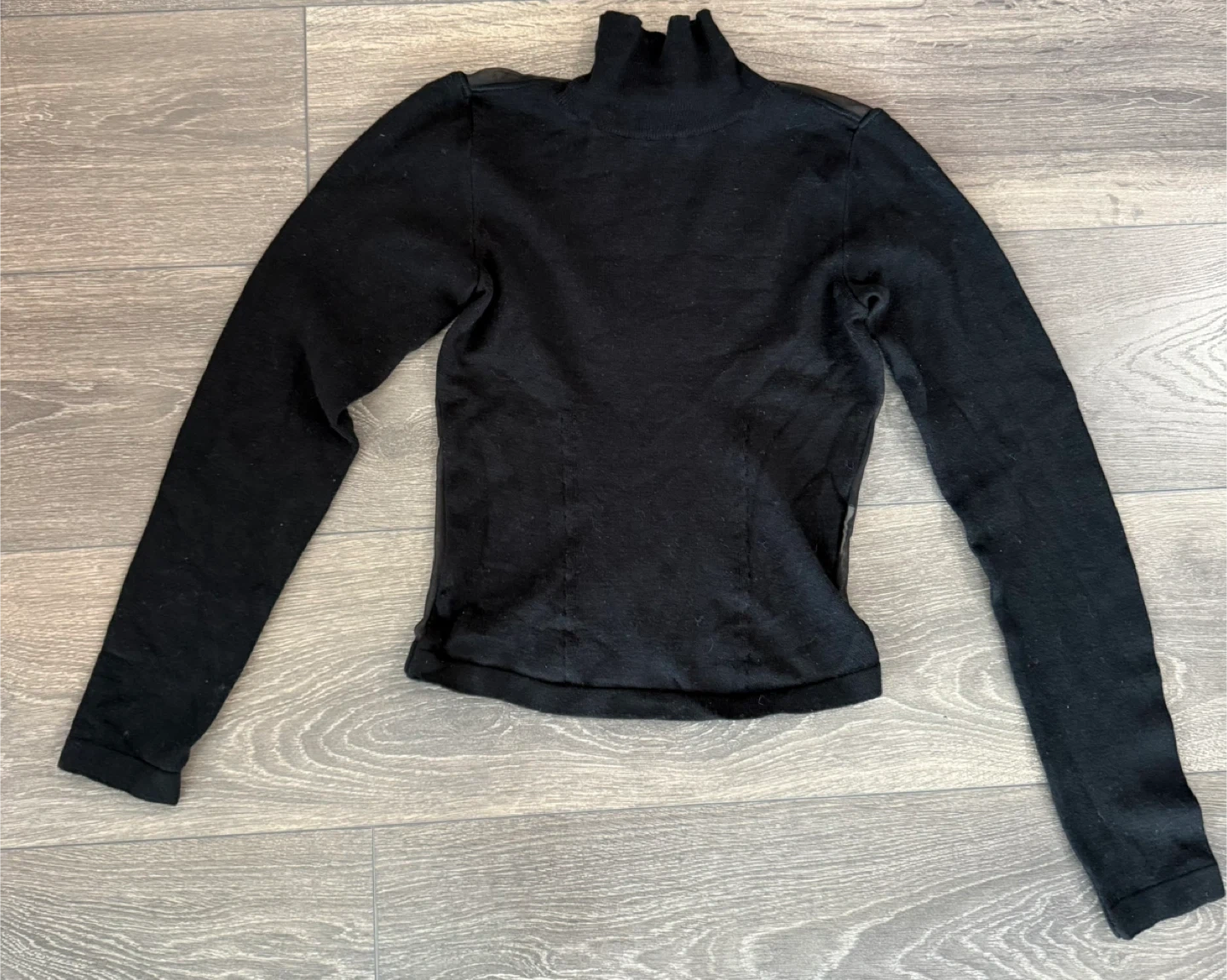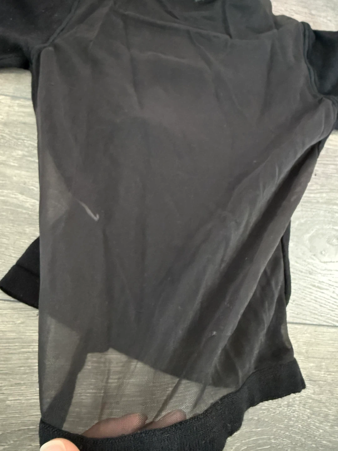 100Selling a black long-sleeved top from Gianfranco Ferre. It's a size small and has a unique design with sheer panels. Perfect for layering or wearing on its own! Small fit