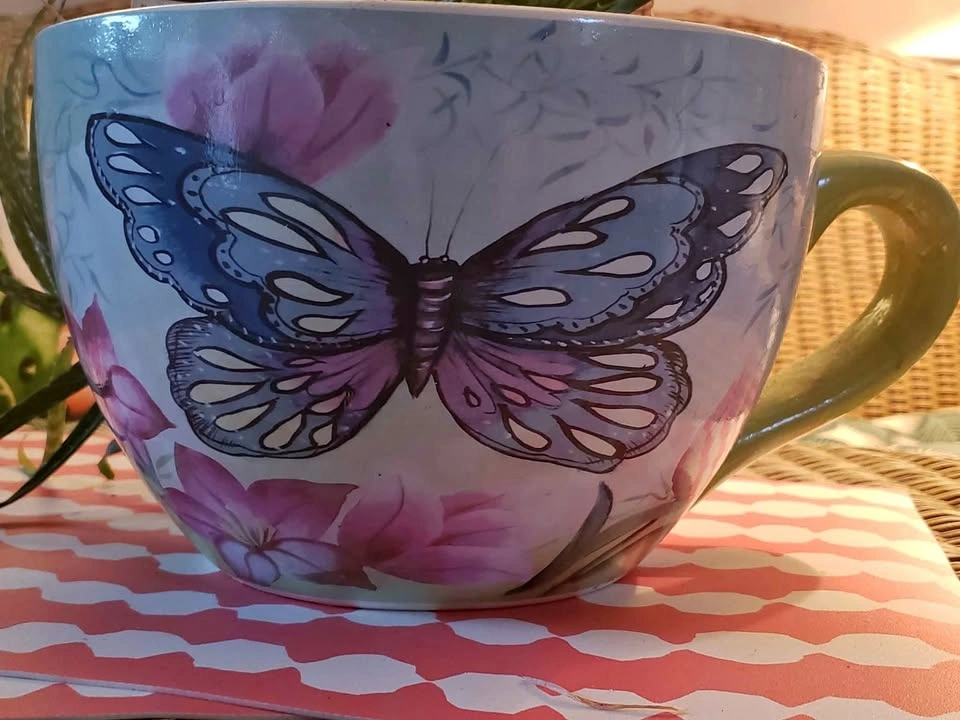 25Giant tea cup planter. Whimsical butterflies. Pink and green. Pardon my dying aloe I wanted a photo with a plant in it still! Will empty and wash when sold. 10 inches across and just under 7 inches high. Beer can for scale (pictured). Real porcelain. Picture is on both sides. Great condition no chips or cracks. Pick up in Upper Lonsdale North Vancouver
