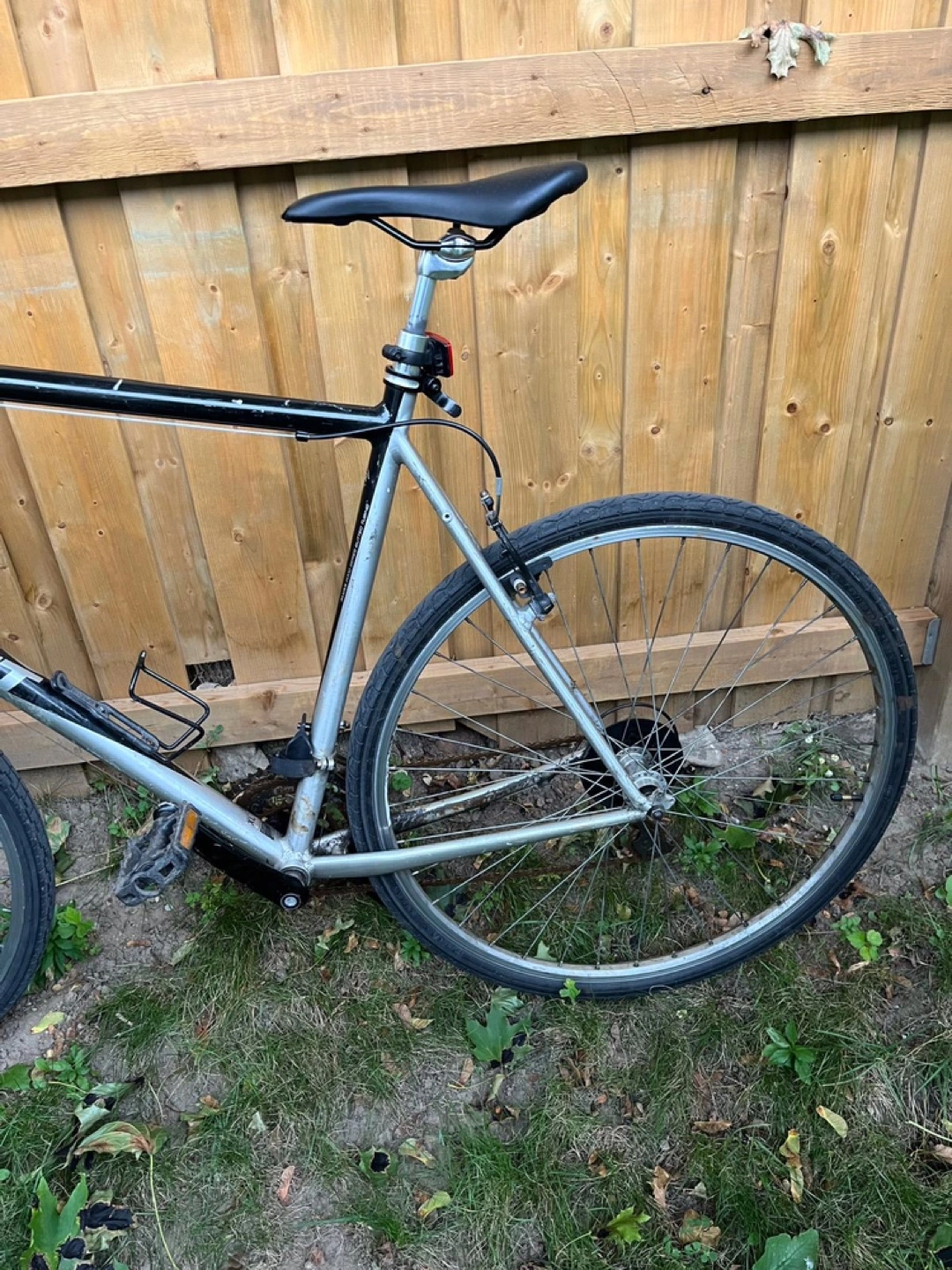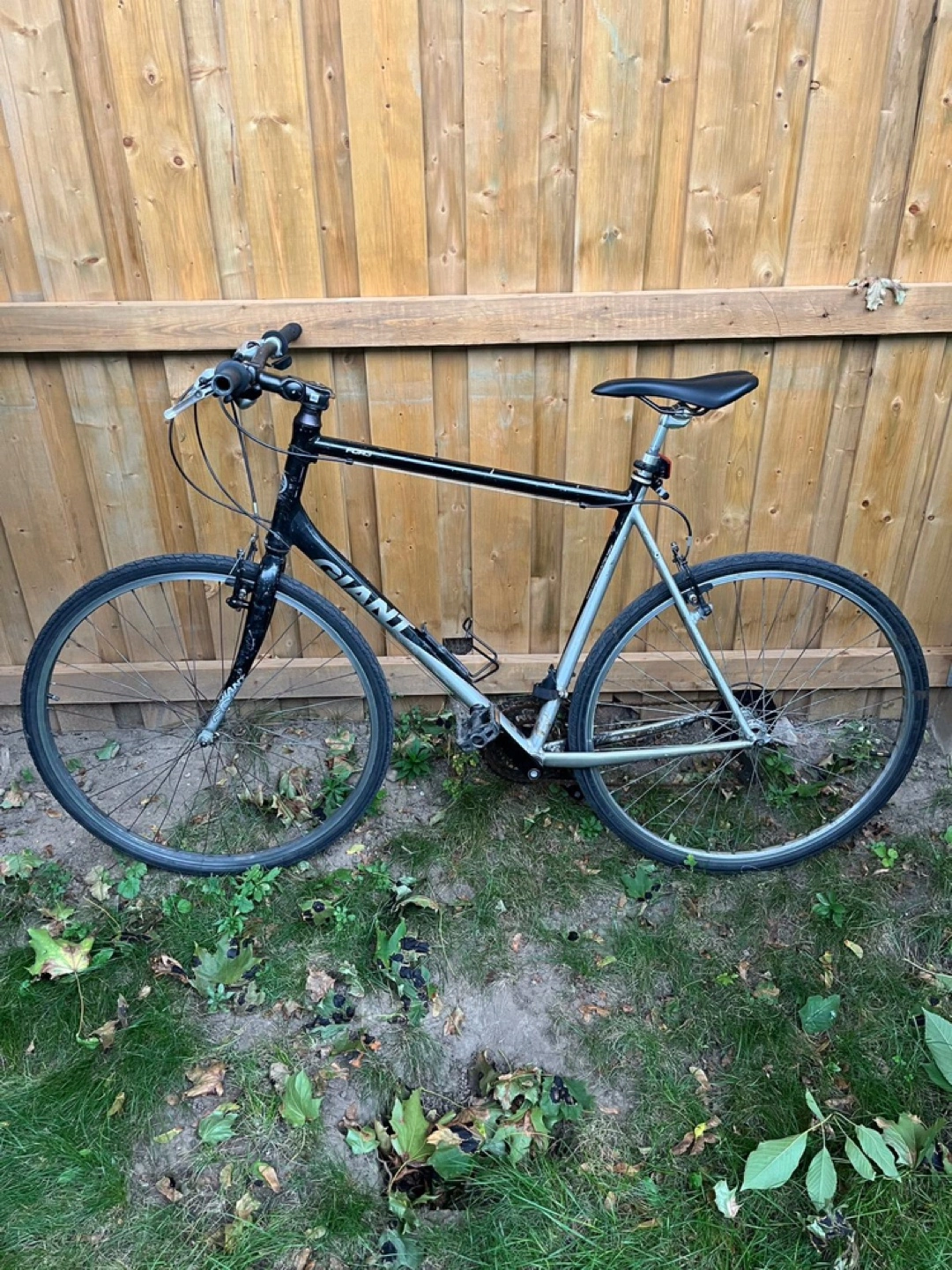 Selling a Giant FCR3 Hybrid bicycle. It has a black and silver frame. A great bike for getting around town!