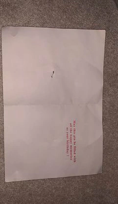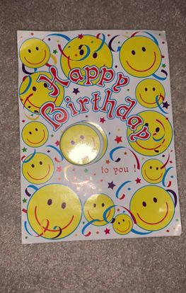 0A little crumpled as seen in the 2nd photo, but otherwise good quality and hasn’t been used, it’s an empty card. There's a pin clip of a smiley face in the front of the card seen in the first picture which is pretty cool :) Size: a bit bigger then an average lined piece of paper
