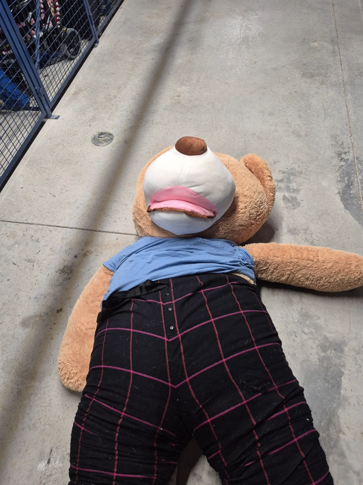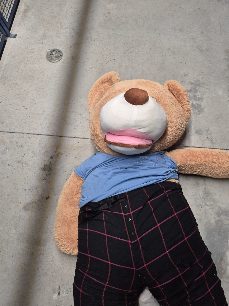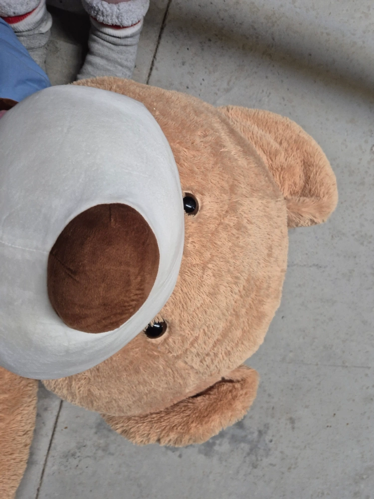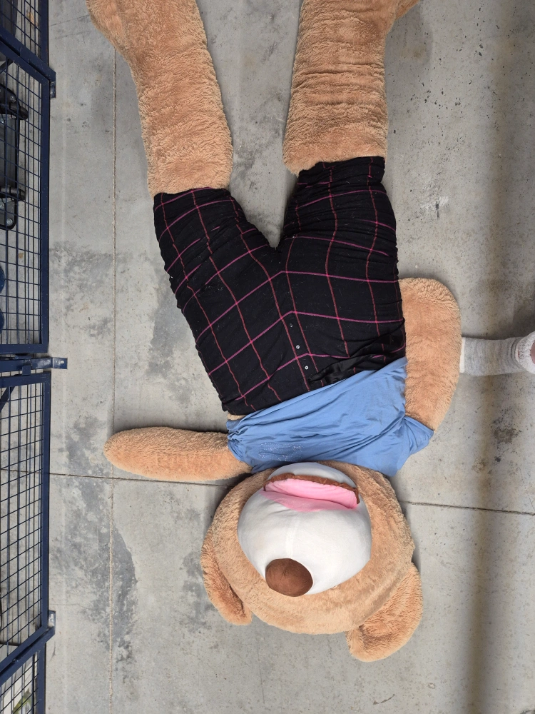 Selling a giant teddy bear! It's wearing a blue shirt and plaid pants. Perfect for a kid's room or for anyone who loves big cuddly toys it's 6 ft 5.