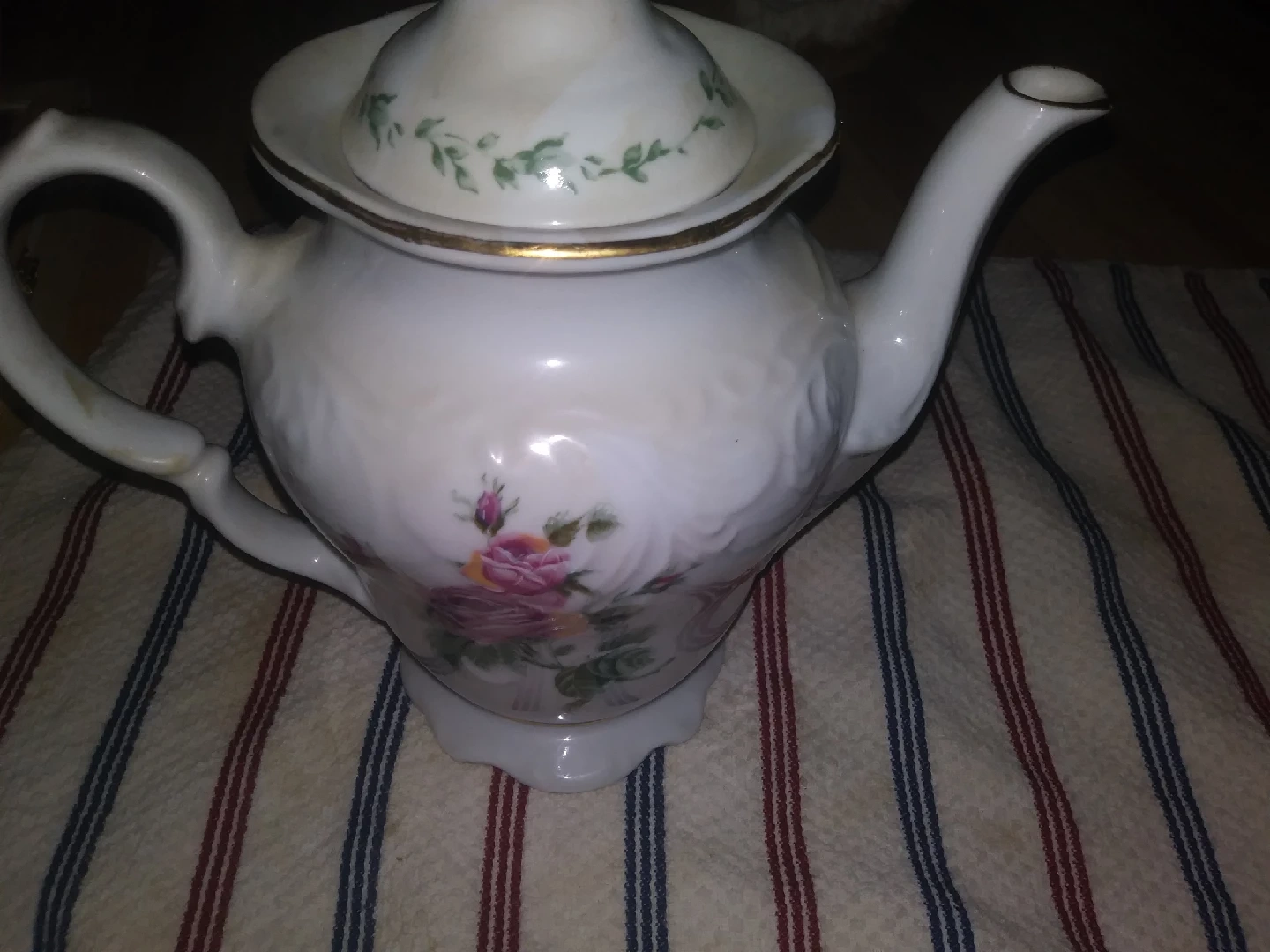 36A charming vintage teapot featuring a delicate floral design with roses and green leaves. The teapot comes with a matching lid. It would make a lovely addition to any tea set or a beautiful decorative piece for your home