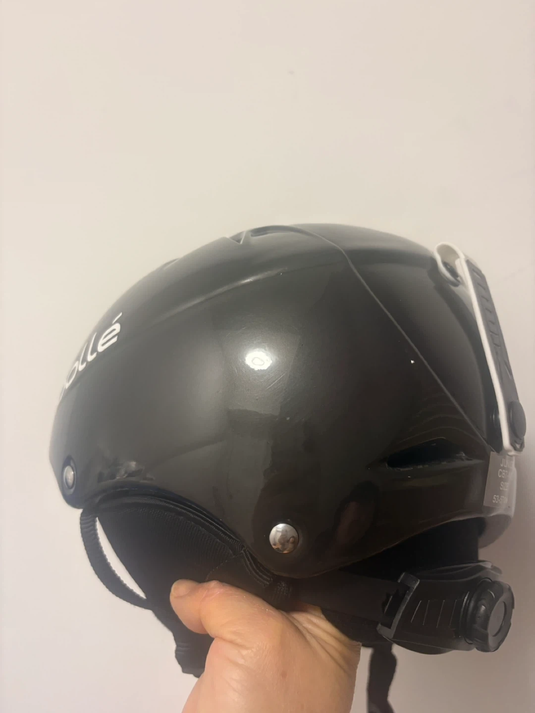 This is a black Bolle junior ski helmet. It's size 53-57 cm, perfect for youth skiers. It's designed for safety and comfort on the slopes!