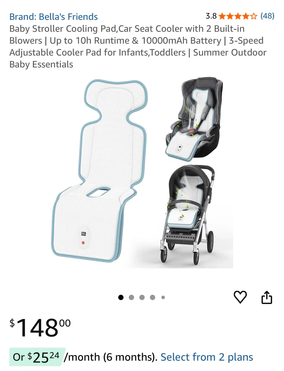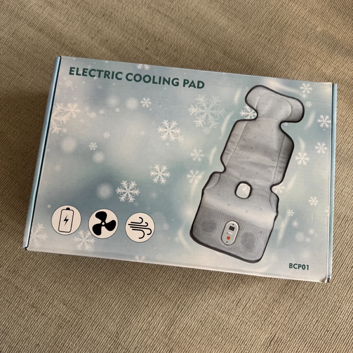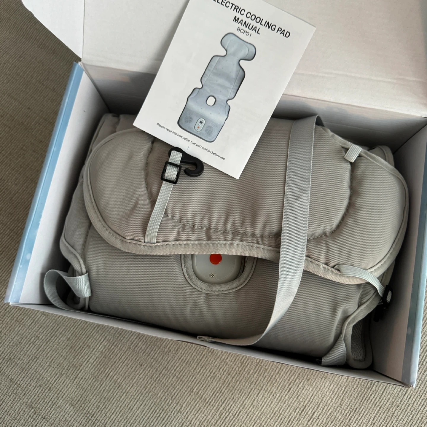 This is a brand new Bella's Friends electric cooling pad for babies. It's designed for strollers and car seats, featuring built-in blowers and a 10000mAh battery for up to 10 hours of runtime. The pad is adjustable and comes with a manual.