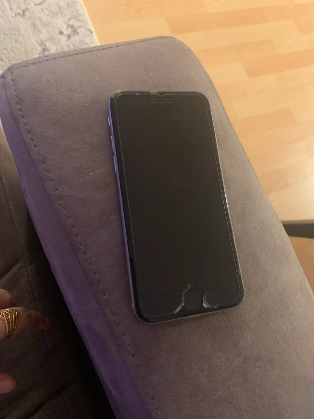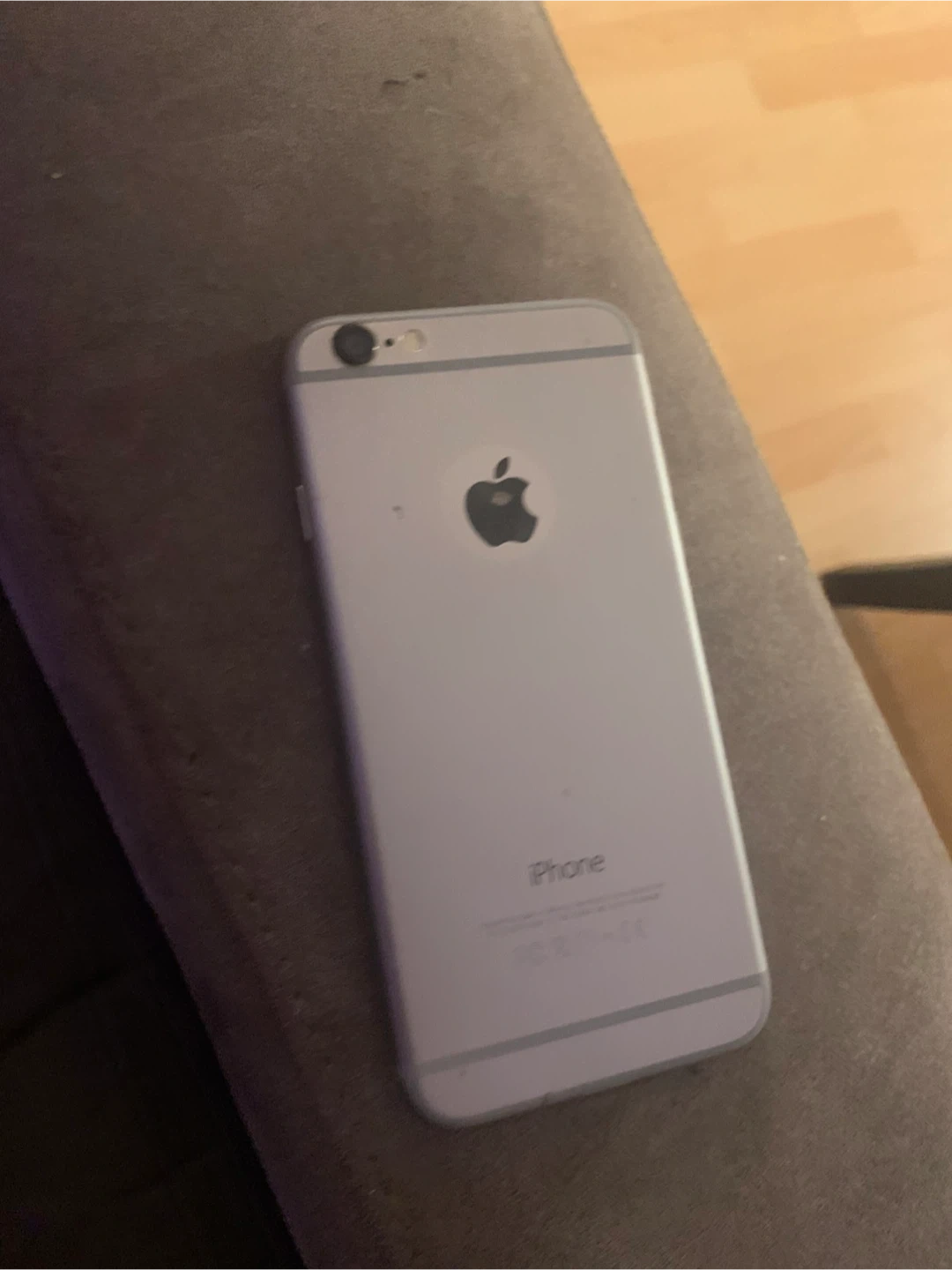 This is an Apple iPhone 6 in silver. It's a used phone with a black SAVFY phone case included. The phone case has some wear, and a circular sticker residue on the back.