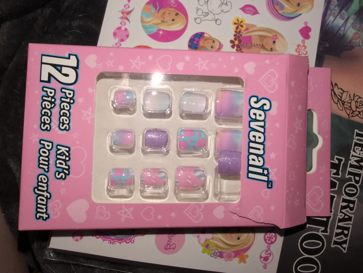 This Disney Princess nail set comes with 27 pieces and includes nail stickers and gems. There's also a bonus sheet of nail files included. It's for ages 6+ and has a $4.97 price tag on it. Also included is a sheet of Barbie temporary tattoos.