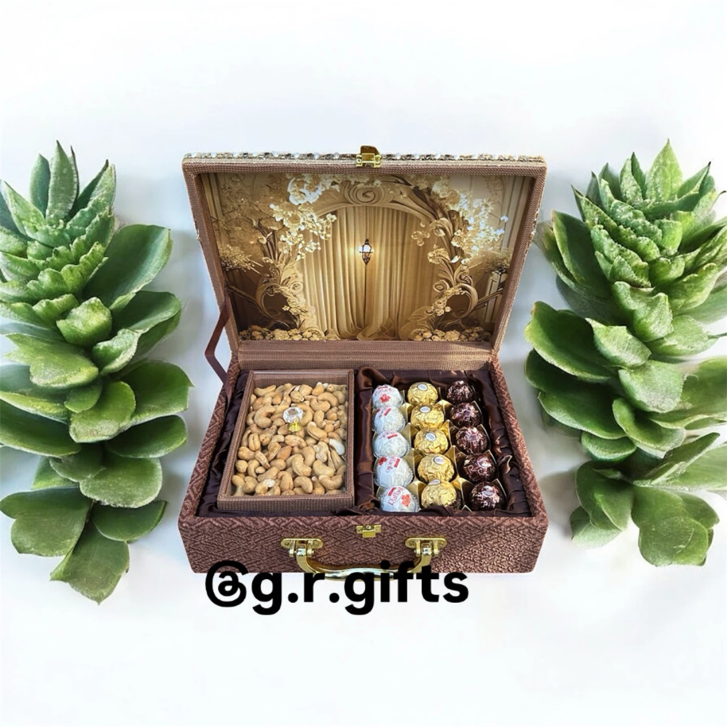 Selling a lovely gift box. It includes cashews and a variety of chocolates. Perfect for a special occasion or a thoughtful gift!